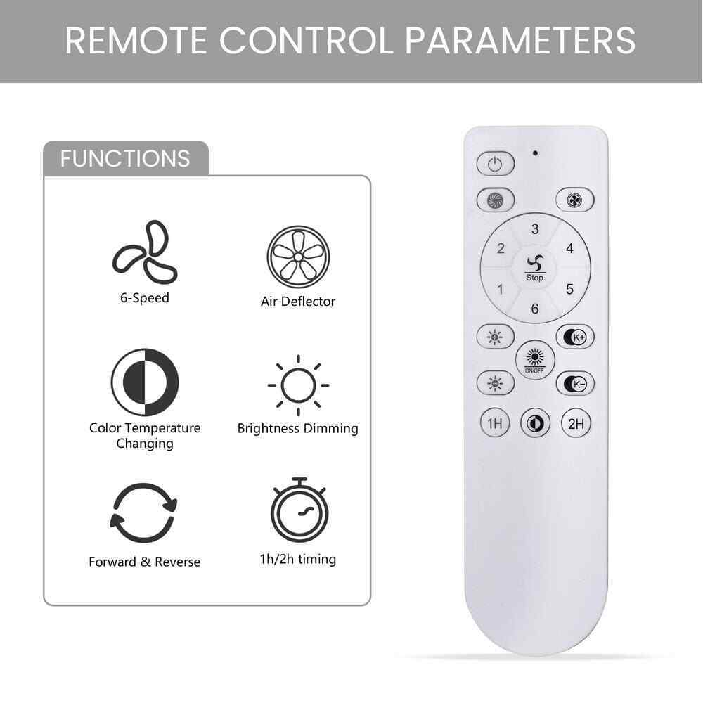 - Remote control & APP control - Smart ceiling fan with lights can be controlled through either remote control or APP, allowing you to set up 6 wind speeds, stepless color change (3000-6500K), stepless dimming (5%-100%), night light, air deflector control and 1h/2h timer (Remote control requires AAA 1.5V batteries x 2)