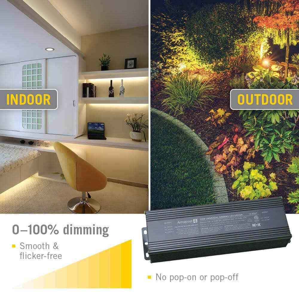 The Armacost Lighting 120-Watt; 12-Volt Universal Dimming LED Power Supply delivers stable and energy-efficient, low-voltage power to any LED lighting installation. The LED lighting driver is designed using high-performance, professional grade electronics that provide stable 0 or 100% dimming free of any pop-on or drop-off. The power supply is rated up to 120-Watt at 12-Volt For the best results use Armacost Lighting LED lights, switches and dimming light controls. Plug-in or hardwire with detachable AC power cord. Suitable for both dry and wet locations. Enclosure option available. Includes: one 120-Watt, 12-Volt Power Supply.- Smooth, full range, flicker-free dimming