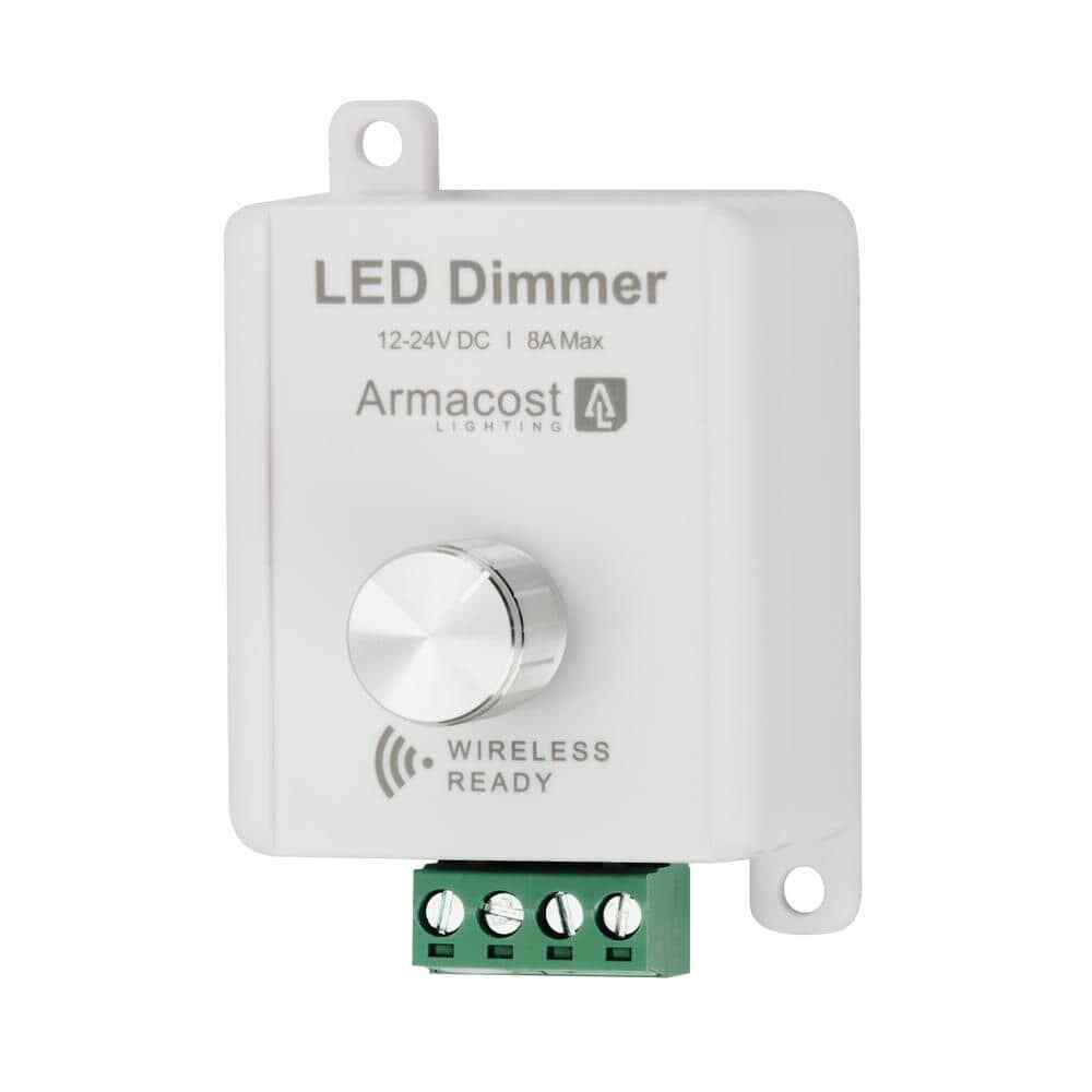 The Rotary Knob LED Dimmer from Armacost Lighting provides smooth, flicker-free dimming for white or single color LED light installations. The unique, convertible design lets you install the dimmer directly into a standard switch box or surface mount anywhere for easy, precise control of your LED lighting. For even more flexibility, couple this dimmer with the optional Wall-Mount Wireless Touchpad (item#523121 sold separately) for completely wireless, RF control of your LED lighting. For use only with 12-Volt or 24-Volt DC low-voltage LED lighting. Do not connect to 120-Volt AC current.