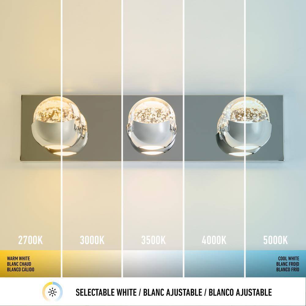 Beautify your home with the daring Oracle 4 light vanity 5CCT. Its breathtaking contemporary design allows This suspended luminaire to leave a striking impression on anyone that sets their eyes on it. With a charmingly unbalanced style and 4 chrome-finish lights that resemble giant bubbles, this decorative piece can easily take pride of place in your home. The Oracle 4 isn't just visually stunning, it is also equipped with a very high lighting capacity and boasts a remarkable Product lifetime. What's more, Its integrated LED lights make it the perfect luminaire for energy savings. Treat yourself to a vanity fixture that shines on all fronts and gives your decor a highly modern touch.- 1600 Lumens