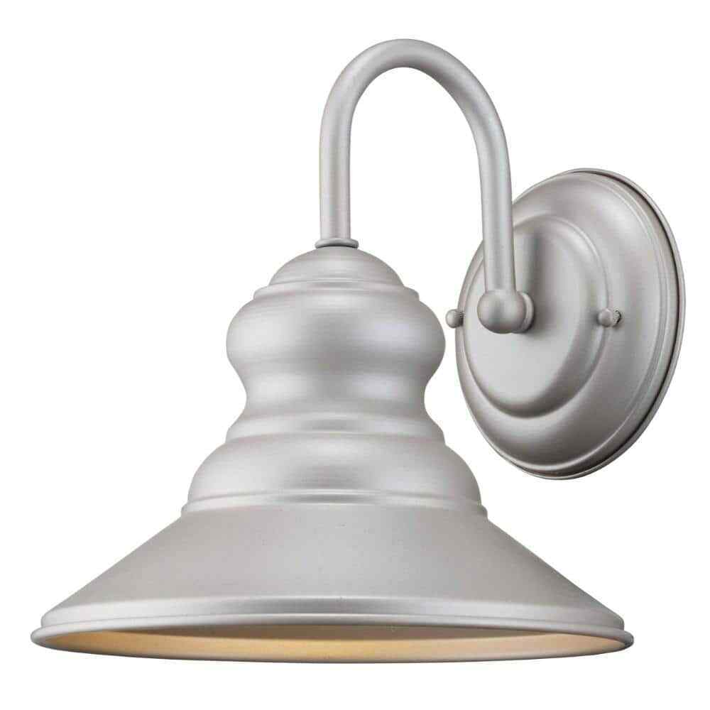 This 9.25 inch round barn-inspired outdoor wall light from Bel Air features a goose-neck arm and flared metal shade with a matching round wall plate. The shade is open at the bottom to allow full illumination from the single down light inside, and to allow easy access to change the bulb. The vintage farmhouse industrial look and metallic silver finish will compliment many different exterior home styles while adding a sleek and rustic touch. The size and style of this barn light lantern is ideal for illuminating porches, exterior entryways, and decks.- Industrial outdoor wall light with farmhouse appeal