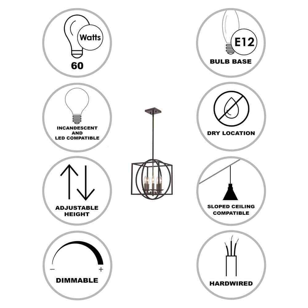 Bel Air Lighting's transitional caged chandelier collection offers a unique way to bring functional illumination to your home's foyers entrances, dining areas, and kitchens. The collection is highlighted by its geometric designs and trendy two-toned finish combinations. The 16 inch wide chandelier is the medium sized hanging light in the family and uses five candelabra bulbs to light up your home's interior living spaces. The pendant body exhibits unique metalwork with an inner ringed globe shade surrounded by a square caged metal frame. The body contains no glass, making it easy to access the light bulbs and easy to clean. The black finish on the frame is offset by the metallic brushed nickel socket covers and accents, offering a unique and eye-catching design. A matching black mounting canopy and extension rods are included which allow for a customizable hanging height. The interesting modern geometric style makes this chandelier an ideal centerpiece over a dining room or kitchen table.- Two-toned black finish with brushed nickel accents