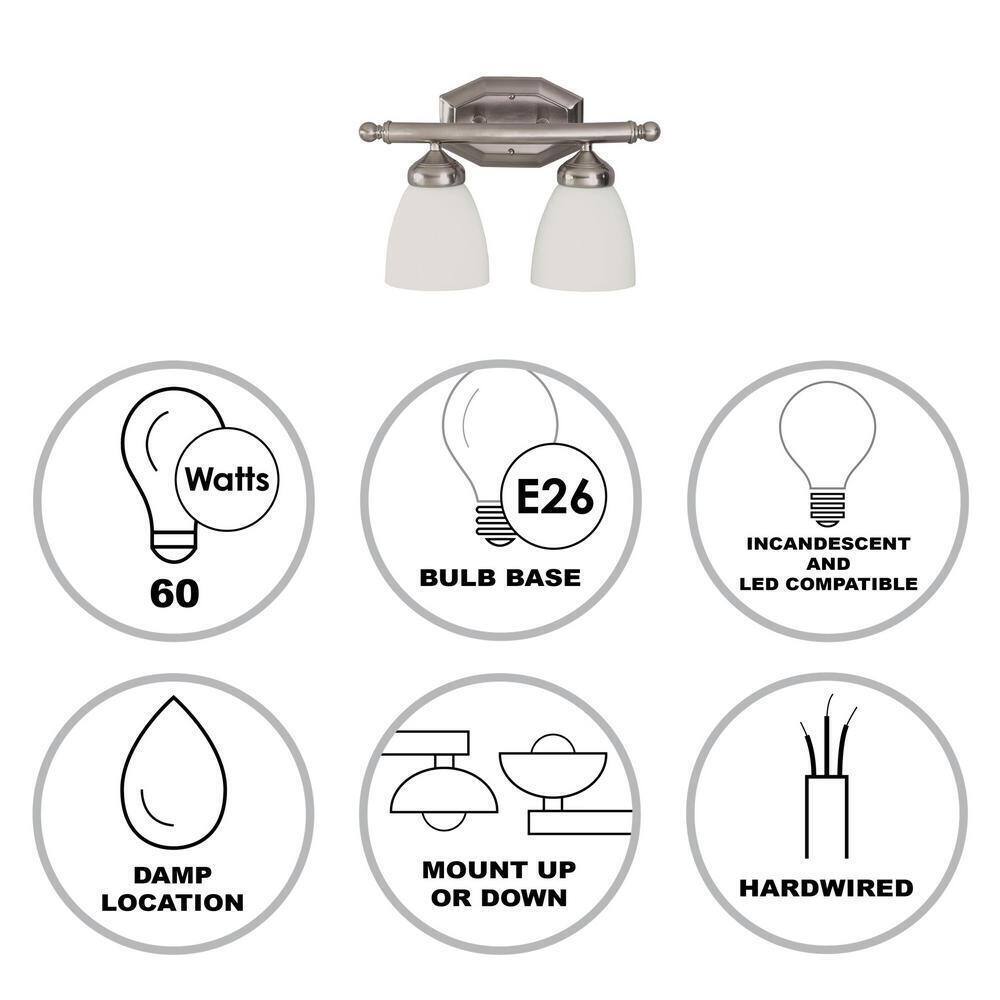 The Ashlea Collection from Bel Air exhibits contemporary styled vanity lighting with metallic finishes and contrasting whited frosted glass shades, designed to complement a wide variety of bathroom and powder room decor styles from transitional to modern. The Ashlea 16 inch vanity light is finished in brushed nickel and includes a coordinating octagon-shaped wall plate and straight arm detail to hold the two shades in place. The bell shaped shades are open at the bottom to allow for directional lighting from the 60-watt bulbs inside. This wall light is damp rated and can be mounted anywhere in the home for additional accent and task lighting. The piece looks great as a single unit, but also works well when mounted in multiples over a double bathroom sink or mirror. The Ashlea Collection is versatile, and can be mounted upwards or downwards for a customized look.- Brushed nickel finish coordinates with existing bathroom hardware