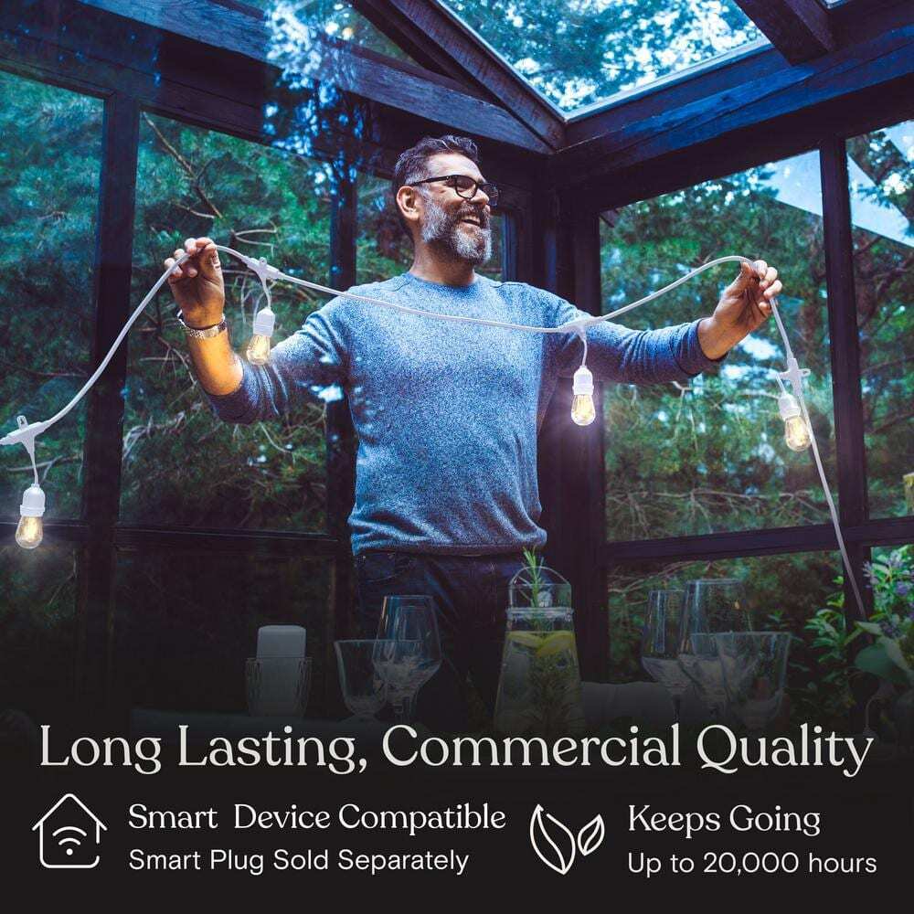 Brightech is US owned and operated, family-run small business, founded with a simple premise in mind: offer sustainable lighting at prices accessible to everyone. Outfitted with Brightech's WeatherTite commercial grade, heavy duty cord, this 15 bulb LED string light can be used all season long to lend a classic feel to any backyard, balcony, patio, terrance, porch, or interior. With easy-to-hang loops positioned over each glass bulb, the Brightech Ambience Pro can be easily installed and arranged for mood-lighting your summer barbecues, birthday parties, and holidays such as Valentines Day and Christmas. Both vintage and high tech, this 48ft LED string light with Edison filaments fills your space with 2700K soft white glow while only consuming 2W of electricity per bulb, meaning your electricity bill will benefit from this energy saving lighting solution. Both dimmable and smart home compatible, this string light transports you to a classic cafe ambience in seconds (dimmer and smart home plug sold separately).- 48ft Commercial Grade Wire with 3ft of space between bulbs