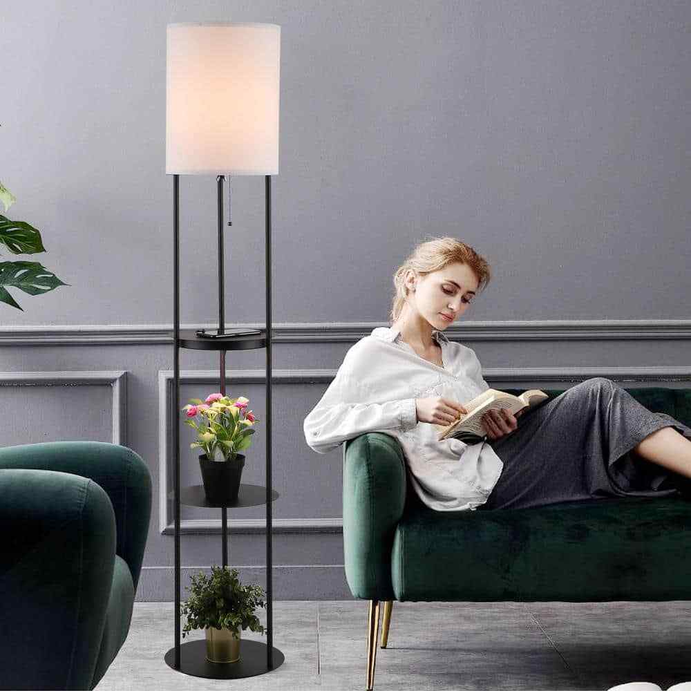 The shelf floor lamp has 2 USB charging ports and 1 power outlet, making it more convenient to charge the device. This classic black floor lamp very suitable for bedroom, living room, or office. With 3 open shelves provide enough space for showing your decorations. Off course, you can also be used as storage for books, remote controls, or cell phones.- Black metal frame with round fabric shade make the modern-looking floor lamp can be easily integrated into any room design