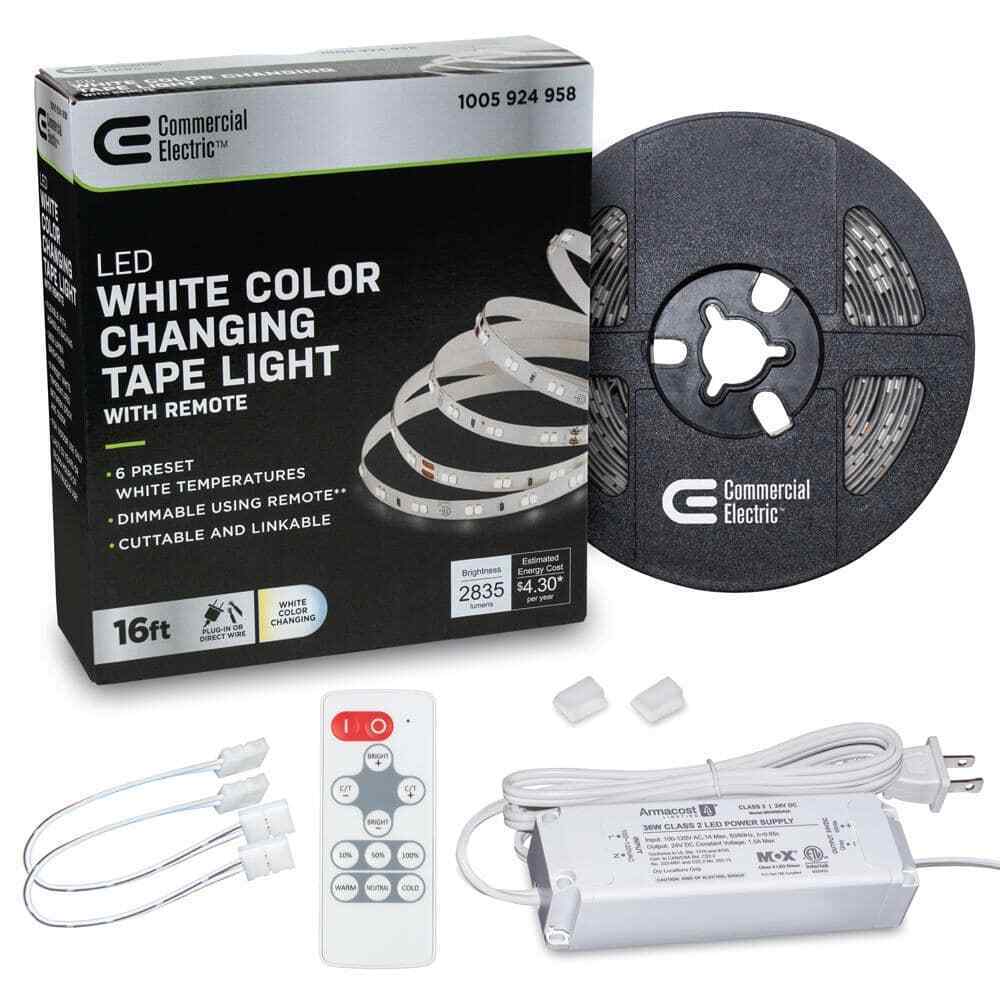 - Includes 16.4 ft. of LED tape light, power supply, remote and 2-tape light connectors