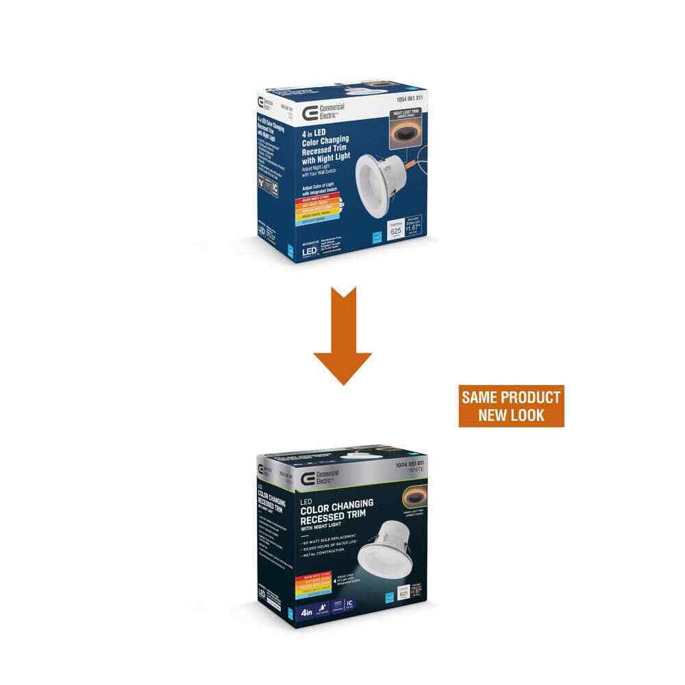 Commercial Electric's 4 in. Integrated LED Recessed Downlight with Night Light Trim feature and multiple light output options is the most innovative recessed fixture on the market. No more buying multiple lights deciding which output looks best, no more going back and forth returning to the store and installing again. All of your lighting options are in 1-box. You choose from 5 color temperatures of light output for your space using a toggle switch on the back of the fixture. Switch on the Night Light feature when you prefer a soft Amber hue for your space, activate it by toggling your wall switch. This light emits 625 Lumens of brightness of premium LEDs using only 10.5-Watt of electricity. It is easy to install and maintenance free with no bulbs to replace. Ideal for kitchen, bedroom, living room, family room, basement and so much more.- Offers 2 modes of light output: downlight mode or night light mode