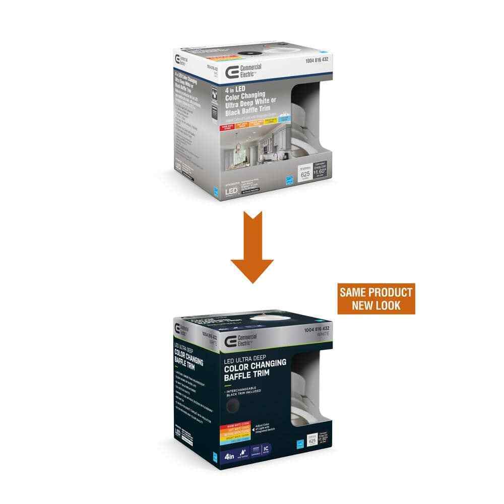 Commercial Electric 4in. Ultra-Low Glare Deep Baffle LED Recessed Light offers anti-glare eye protection to create gentle, balanced and natural lighting on your eyes. The deep baffle shape traps and narrows the light minimizing glare and softening light output for comfortable lighting in your home or office. Prior to installation, choose from 2 interchangeable deep baffles; Black or White. Next, choose between 5 color temperatures of light output: Warm White, Soft White, Cool White, Bright White and Daylight. This fixture is easy to install and maintenance free with no bulbs to replace. Great for bedroom, kitchen, family room, living room, den/office, playroom, pantry or retail; dressing rooms or lobby.- Deep baffle anti-glare eye protection softens light for more balanced and natural lighting - No ghost images or flickering