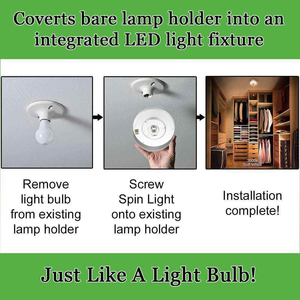 Commercial Electric 7in. Spin Light LED Flush Mount with Brushed Nickel Accent and Pull Chain is designed to screw into most existing plastic and porcelain lamp holders without any wiring required. (Direct wire option is available using bracket included in box). Converts your lamp holder to a fixture in no time at all. For quick activation, use the pull chain for an easy grab. Great for closets, bathrooms, stairways, pantry, basement, garage, attic or laundry room.- Converts bare lamp holder into an energy-efficient LED fixture