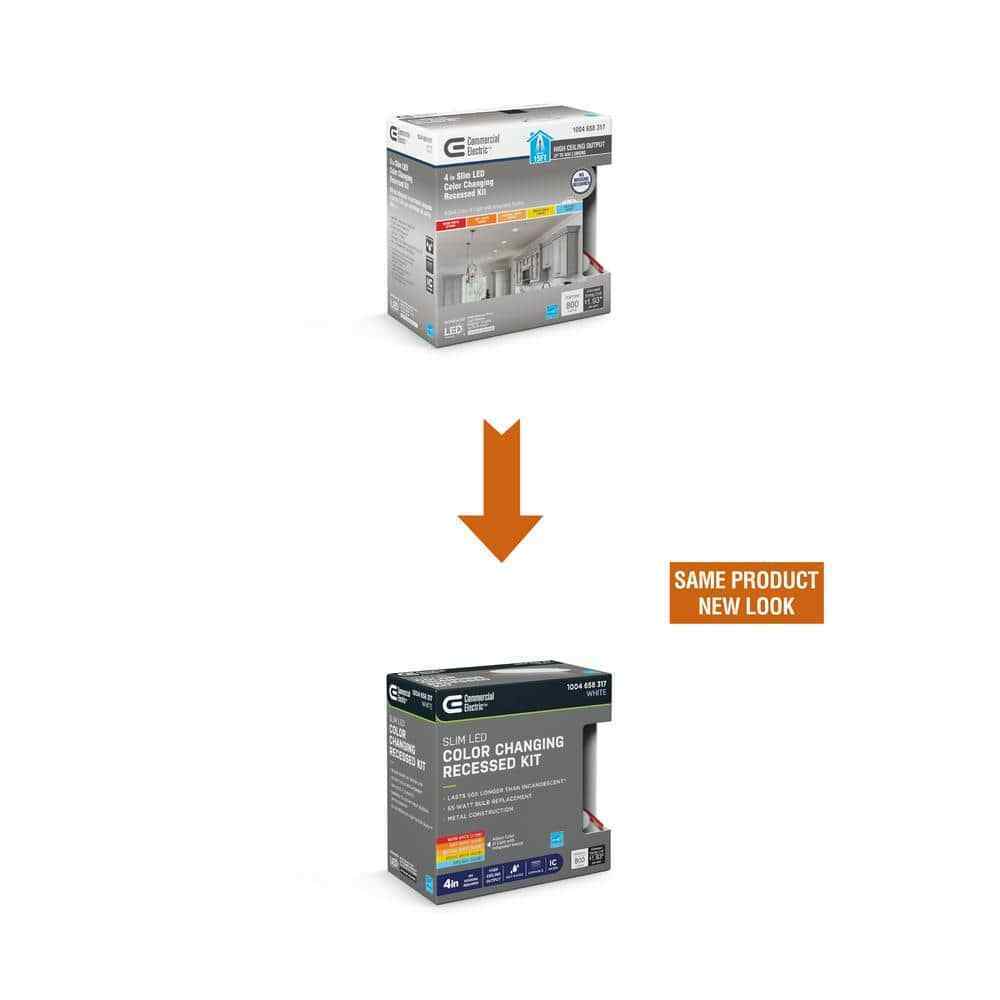 The Commercial Electric Color Selectable Recessed Lighting Kits are the recessed lights of the future. Not only is each fixture is designed specifically for small spaces where height clearance is limited such as beams or ductwork, you can change the color temperature with a flick of a button. The integrated color changing switch is located on the cable so you can choose between a 2700, 3000, 3500, 4000 or 5000 Kelvin temperature to best suit your needs. 2700 or 3000 Kelvin is perfect for relaxing, 3500 or 4000 Kelvin is the ideal choice for everyday affairs and 5000 Kelvin is great for task lighting in a basement, hallway or work area. ENERGY STAR certified and IC rated for direct contact with insulation, these lights won't overheat, do not require a bulky can and will last for-years to come - 50000-hours or approximately 34-years if used for 4-hours per day to be exact. Wet rated and certified airtight, this 4 in. kit is perfect for your bathroom, drop ceilings, outdoor soffits and all general lighting applications. The smooth baffle is designed to absorb excess light and reduce glare significantly - quintessential for the glasses wearers in your home.- Selectable color temperature: with the flick of a button, choose the color temperature that works best for your space - 2700 to 3000 kelvin is perfect for relaxing, 3500 to 4000 kelvin is the ideal choice for everyday affairs and 5000 kelvin is great for task lighting in a basement, hallway or work area