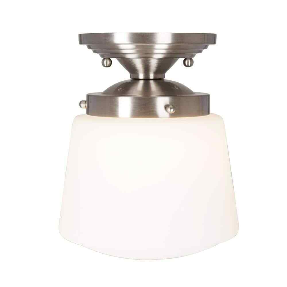 A true classic never goes out of style. This LED vintage style semi Flushmount with brushed nickel hardware and school house opal glass shade delivers brilliant lighting and design. The enclosed clear glass shade brightly illuminates and the fixture's size and damp-rating make it ideal for various spaces. Add light and timeless style to an entryway, bathroom, kitchen, closet, home office or dining nook. Dimmable when used with wall dimmer switch (not included). The glass shade encloses high-quality LED lights, delivering 3000k/600 lumens and an excellent color-quality rating of 90 CRI that makes colors and skin tones look more natural and boosts contrast. This fixture is hardwired, easy to install and dimmable when used with a wall dimmer switch (not included). Includes all mounting hardware and easy-to-follow instructions.- LED Mid-century modern flushmount ceiling light features schoolhouse style enclosed opal glass shade and metal hardware in a brushed nickel finish