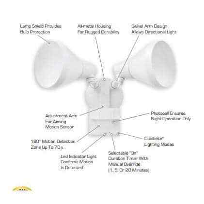 - Dual brite 2-level lighting which offers accent lighting for selected time when no motion present and full bright light for security purpose when motion is detected
