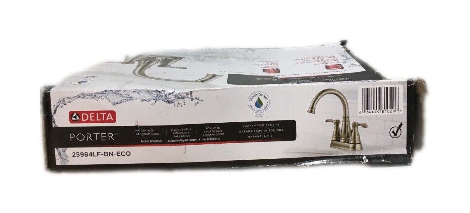 The Delta Porter 4 in. Brushed Nickel Bathroom Faucet enhances functionality and style in any bathroom. This faucet sports a 2-handle design that makes adjusting water flow and temperature effortless. Its WaterSense certification ensures efficient water conservation, while meeting ADA standards for accessibility. Fitting 3-hole installations with 4 in. centers, the high-arc spout provides ample space for handwashing. A matching finish drain assembly is included, enhancing the overall look and utility of the faucet. Perfect for both modern and traditional decor schemes.We are not authorized sellers and/or resellers of Delta products and are not associated with Delta in any way. This item has not been subject to Delta's quality control program, but has been thoroughly inspected by our staff and appears to be in unused, uninstalled, new condition. This item has no warranty provided by Delta, but we provide free returns or replacements within 30-days of purchase, should any issue arise.