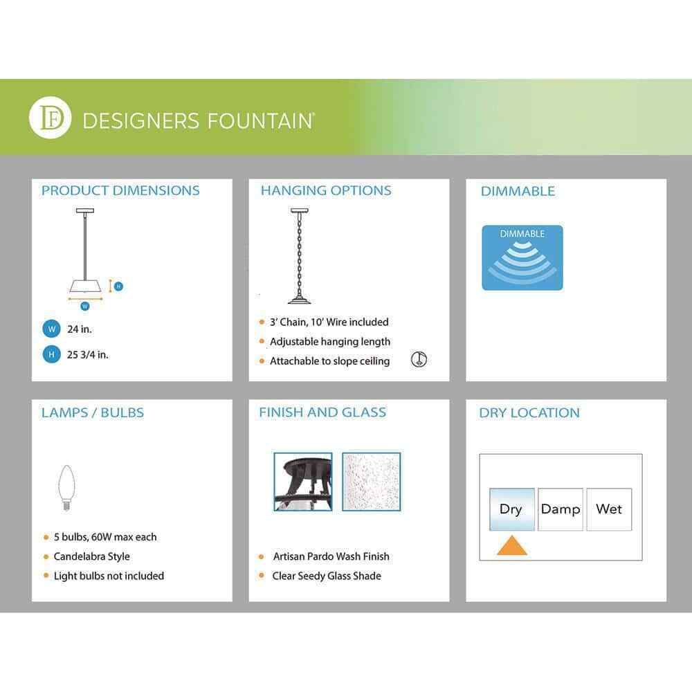 The Palencia Collection comes in Artisan Pardo Wash with Clear Seedy glass. This Traditional Palencia 5 Light Chandelier will complement the decor in any room of your home. Made with solid steel construction to look great and last for years to come.- Artisan pardo wash finish with clear seedy glass shade