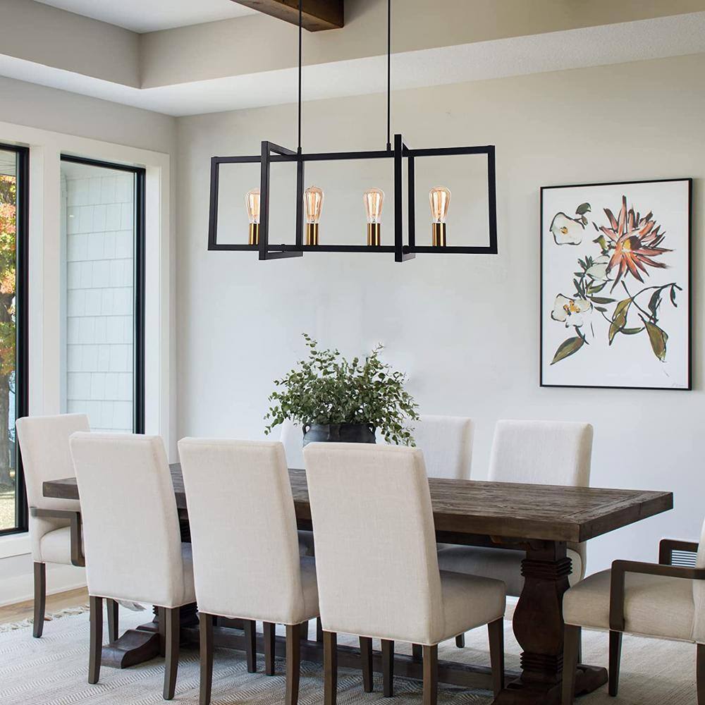 This chandelier featured a geometric frame composed of three intersecting open rectangles shaped, accented by 4 antique brass lamp sockets. The kitchen island light blends well with modern, contemporary, industrial, farmhouse style. The pendant light offers beautiful and soft lighting to enhance your stylish decor.- Modern design: its geometrical and streamlined matte black-finish shade pairs perfectly with its brass sockets, adding nordic and modern character any interior with its trendy look