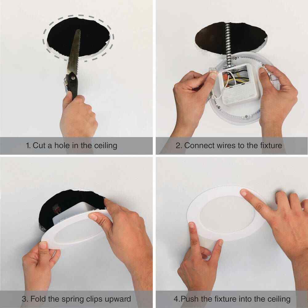 The Edgelit Flat panel 6 in. white canless dimmable retrofit Integrated J-Box LED Recessed Light Kit makes it easy to add downlights anywhere you want. No need for an existing recessed can or junction box in the ceiling and replaces 6 in. recessed light. Simply cut a hole in the drywall based on the instruction sheet dimension stated, run your Romex cable from the direct line voltage to our can less retrofit kit through the knockout to the quick connect terminal, daisy chain additional Romex from the quick connect through the knockout to your next can less retrofit kit, then push the spring-loaded clips through your existing hole. The springs will pull up on the retrofit kit for an airtight seal. The load profile design makes it the perfect option for low plenum clearance for indoor and outdoor residential, hospitality, commercial and multifamily applications with confined, hard to reach spaces such as closets, attics, bathrooms, hallways, stairwells, elevators, soffits, porches and entry ways. The light features built-in white trim, 110° beam angle, produces 800 lumens of 3000K Bright White light using only 12 watts - up to 84% less energy than an equivalent 75-watt incandescent light bulb. A 90+ CRI light makes colors vibrant and skin tones look more natural. With an average life span of up to 50,000 hours/45.6 years based on 3 hours use/day, this light is durable and saving you replacement costs and time. It is also Energy Star certified and CEC Title 24 compliant.- Flat panel design provides 100% even light distribution