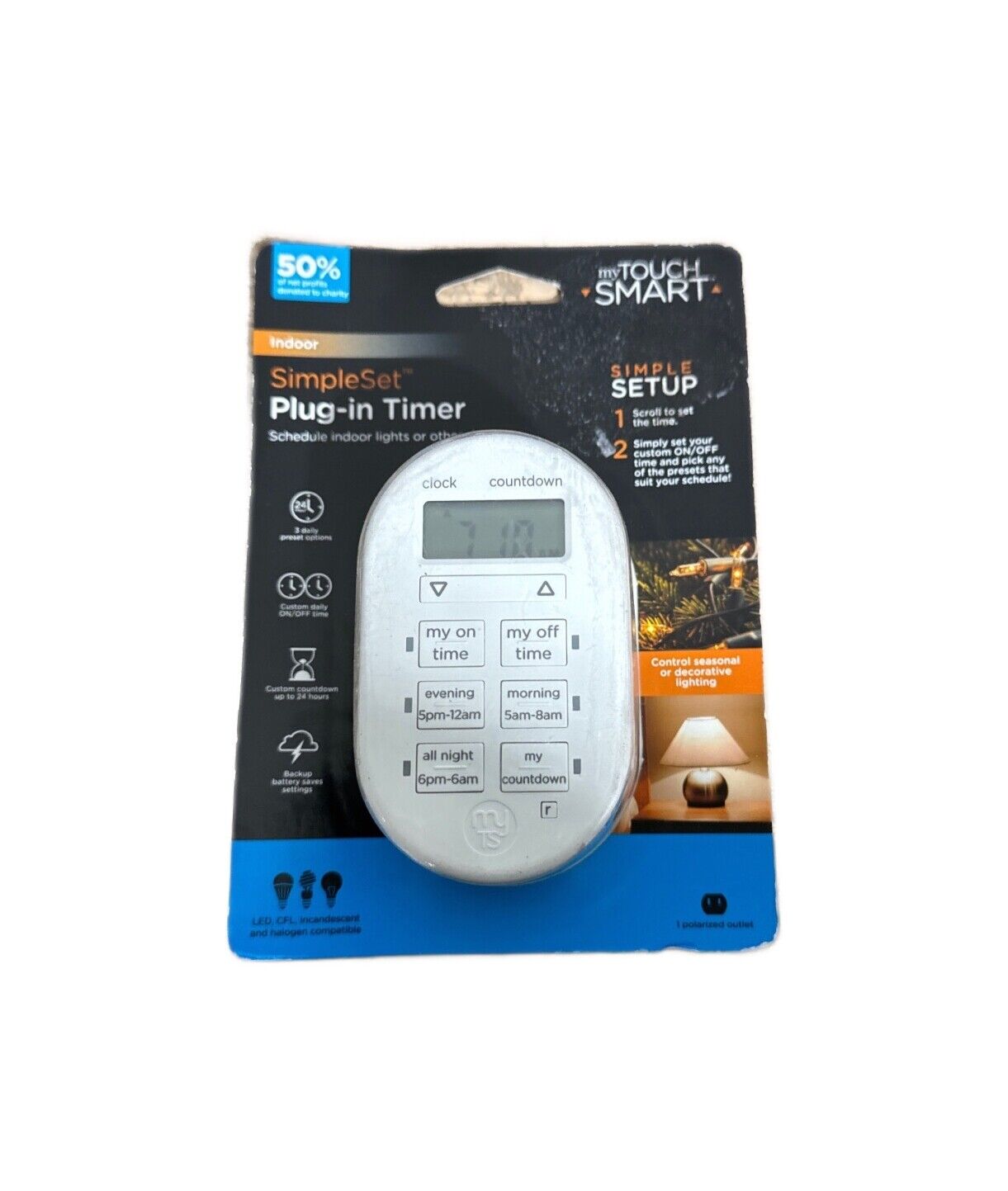 The GE MyTouchSmart Indoor Plug-In Digital Timer is an incredibly easy way to automate your lights to be on when you need them most. Featuring 1 polarized outlet, the time delivers simple automation for indoor lighting and electronics. It is equipped with 3 preset buttons and a full 24-hour countdown option, letting you program the timer with ease. Save energy, save money and feel secure.- Easy-to-set digital timer for indoor lighting and electronics