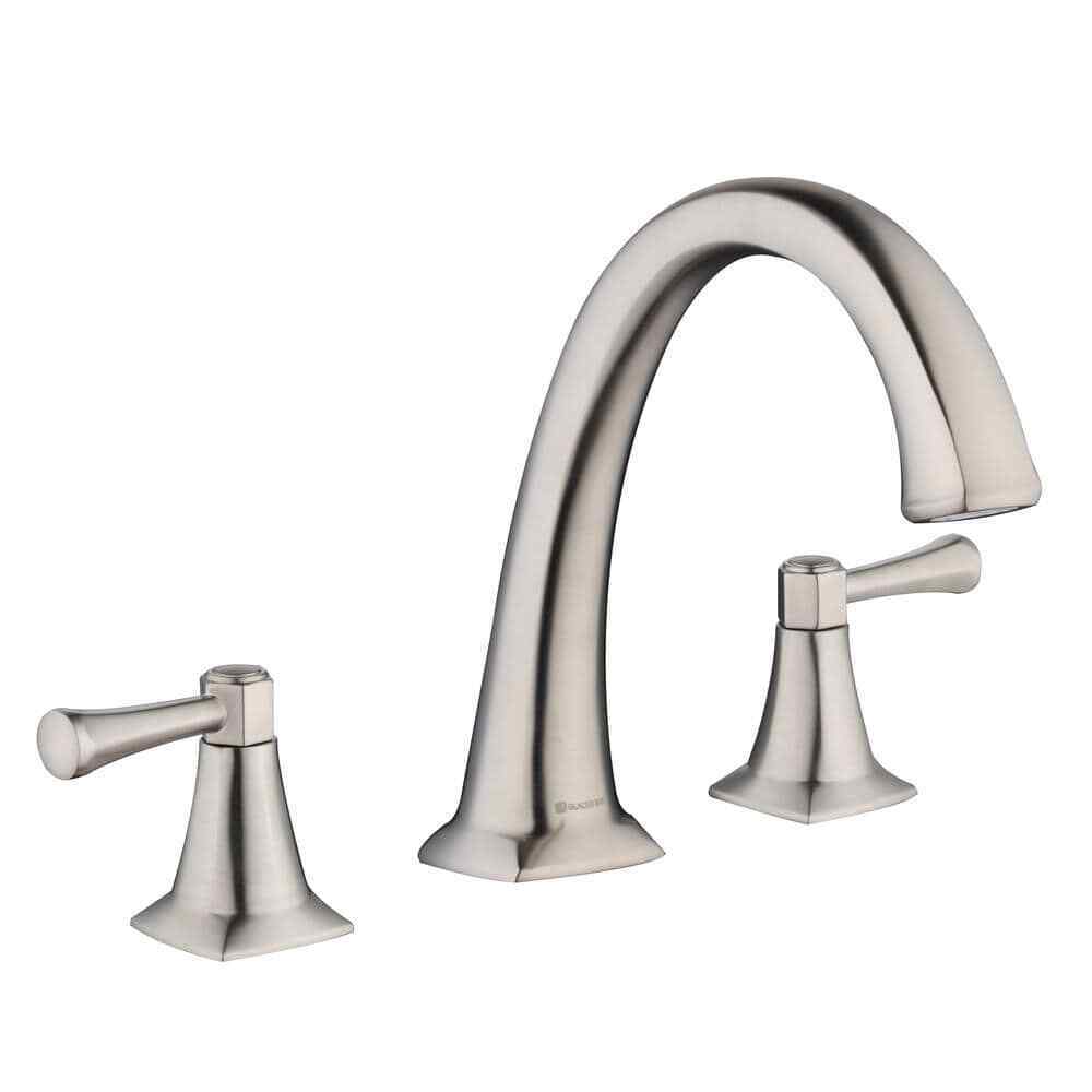 Striking and elegant, this Glacier Bay Stillmore 2-Handle Deck-Mount Roman Tub Faucet in Brushed Nickel will complement any decor. The 2.4 GPM flow rate provides excellent water pressure for a superb bathing experience. Ceramic disc valves ensure drip-free performance. The beautiful high-arc spout provides extra clearance and the two-handle design features separate handles for hot and cold water for precise adjustment. Pair this roman tub faucet with other products in the Stillmore collection for a cohesive look for your bathroom.- 2-handle lever design for precise water adjustment