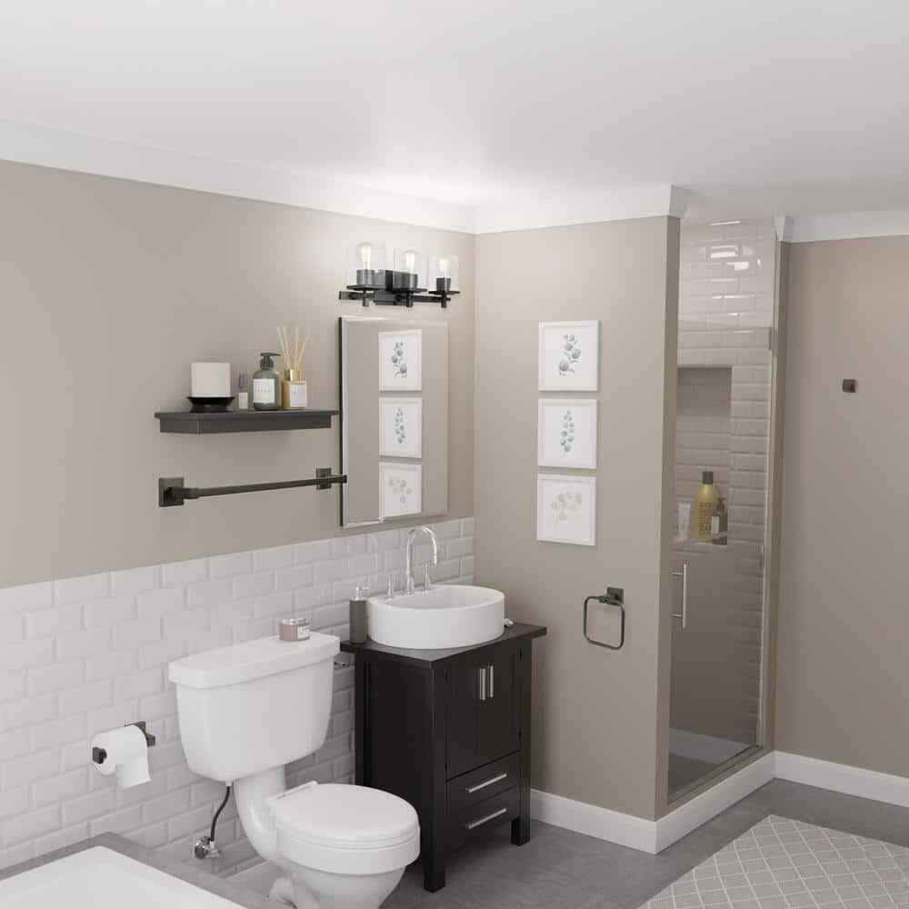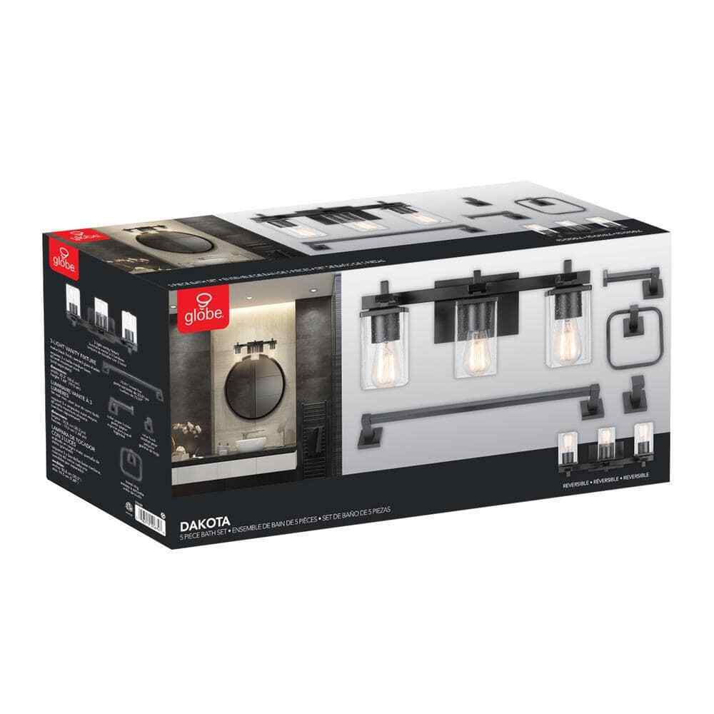 With strong lines paired with vintage accents and a stark matte black finish, the Dakota 5-piece All-In-One Bathroom Set adds an upscale industrial element to any space. The seeded glass and rectangular shades of the vanity light fixture offer a vintage feel while industrial accents complete the look. Update and modernize your bathroom or add the 3-light vanity to your bedroom to create a stunning getting ready nook. Complete with a towel bar, towel ring, robe hook, and toilet paper holder also in matte black, your bathroom will look streamline and welcoming. While the pieces complement each other you can split this set up and use it throughout your home. The towel bar makes an excellent shoe holder. The towel ring would be great in your kitchen. The vanity light would work in your bedroom, bathroom or kitchen. With the ability to use this light as an up-light or a downlight, the options are endless. Unleash your interior designer and think creatively. Think outside the box.- All in one: update your bathroom easily with a matching 3-light vanity fixture, towel bar, toilet paper holder, towel ring and robe hook with a stunning matte black finish
