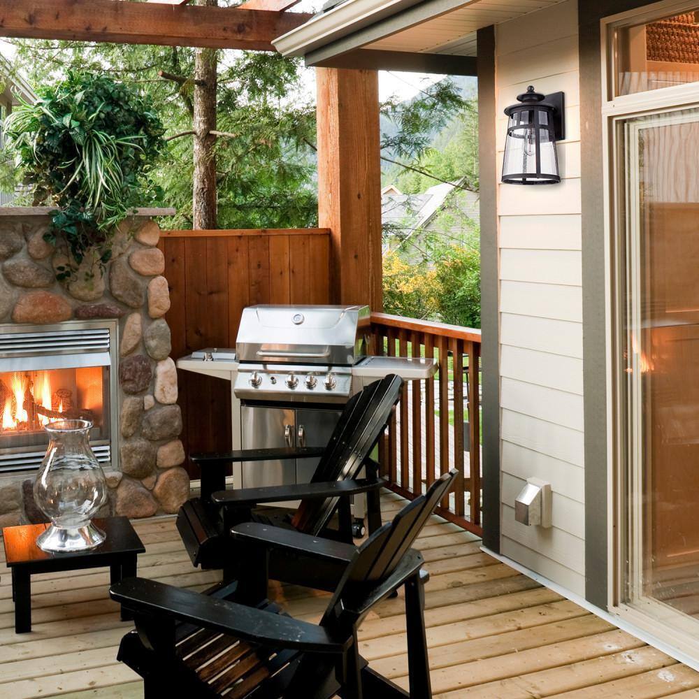 A lantern wall sconce, one of the most popular choices for outdoor lighting, is designed to add a touch of traditional ambiance to your home. The Ezekiel Outdoor Indoor Wall Sconce takes this look and pushes it one step further. Utilizing a dark brushed bronze finish with a seeded glass shade maintains the Vintage charm while sleek craftsmanship leads to unique details that add a modern flair. A strong back plate offsets the bell shade and matching finial detail to create a gorgeous light that looks just as great outside your home as it will inside near your entryway or kitchen.- Vintage series: contrasting raw materials with refined design, modern vintage finishes with sleek craftmanship, the vintage outdoor lighting series exclusively from Globe Electric, brings timeless old-world style to your home