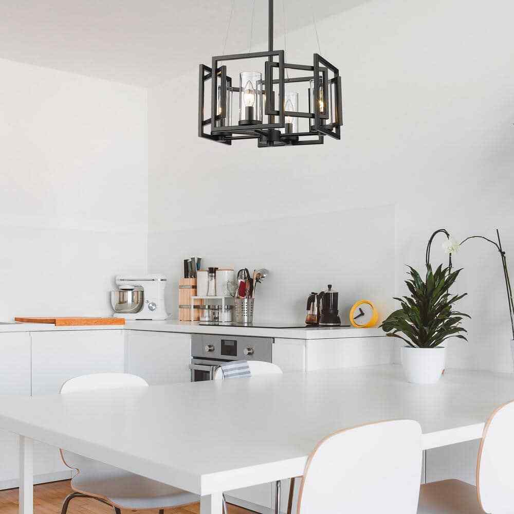 Sleek angles and geometric forms make ultra-modern statements in the Marco collection. The series is offered in multiple finishes that heighten the light airy look of the silhouettes. Clear glass cylinders house stately candelabra bulbs.- Modern style