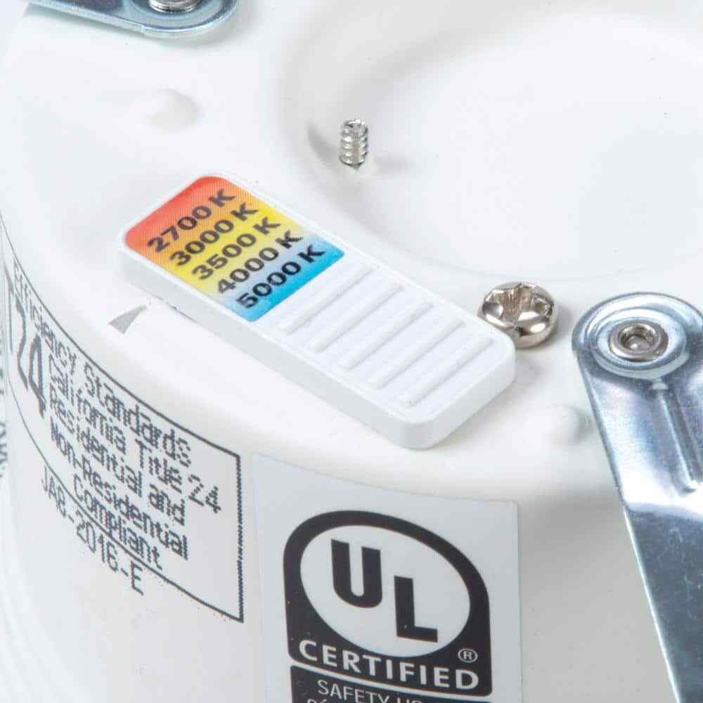 Maintain a bright, well-lit space with this HALO 4-in. retrofit seleCCTable downlight. The switch control lets you easily choose between 2700K, 3000K, 3500K, 4000K and 5000K color temperatures, accommodating a range of lighting requirements. Compatible with retrofit, remodel and new construction installations, this downlight delivers uniform illumination for clear visibility. Closed-cell gaskets inhibit airflow and help comply with building mandates. This HALO 4-in. retrofit seleCCTable downlight features a LED array with a 70,000-hour lifespan at 70% lumen maintenance for long-lasting use.- Impact-resistant polycarbonate material offers durability
