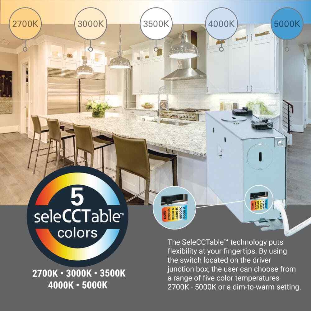 - Selectable color temperature: choose 2700K, 3000K, 3500K, 4000K, 5000K, or dim-to-warm