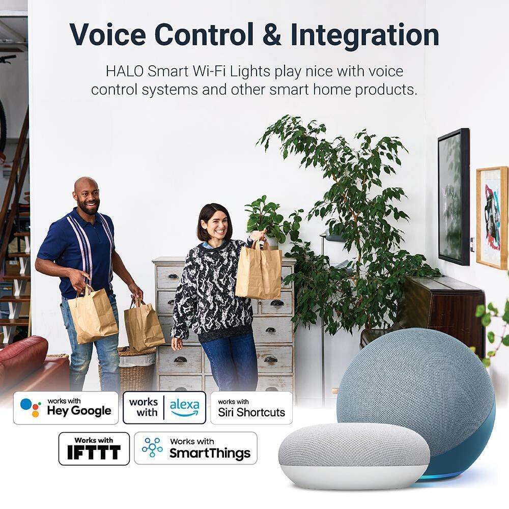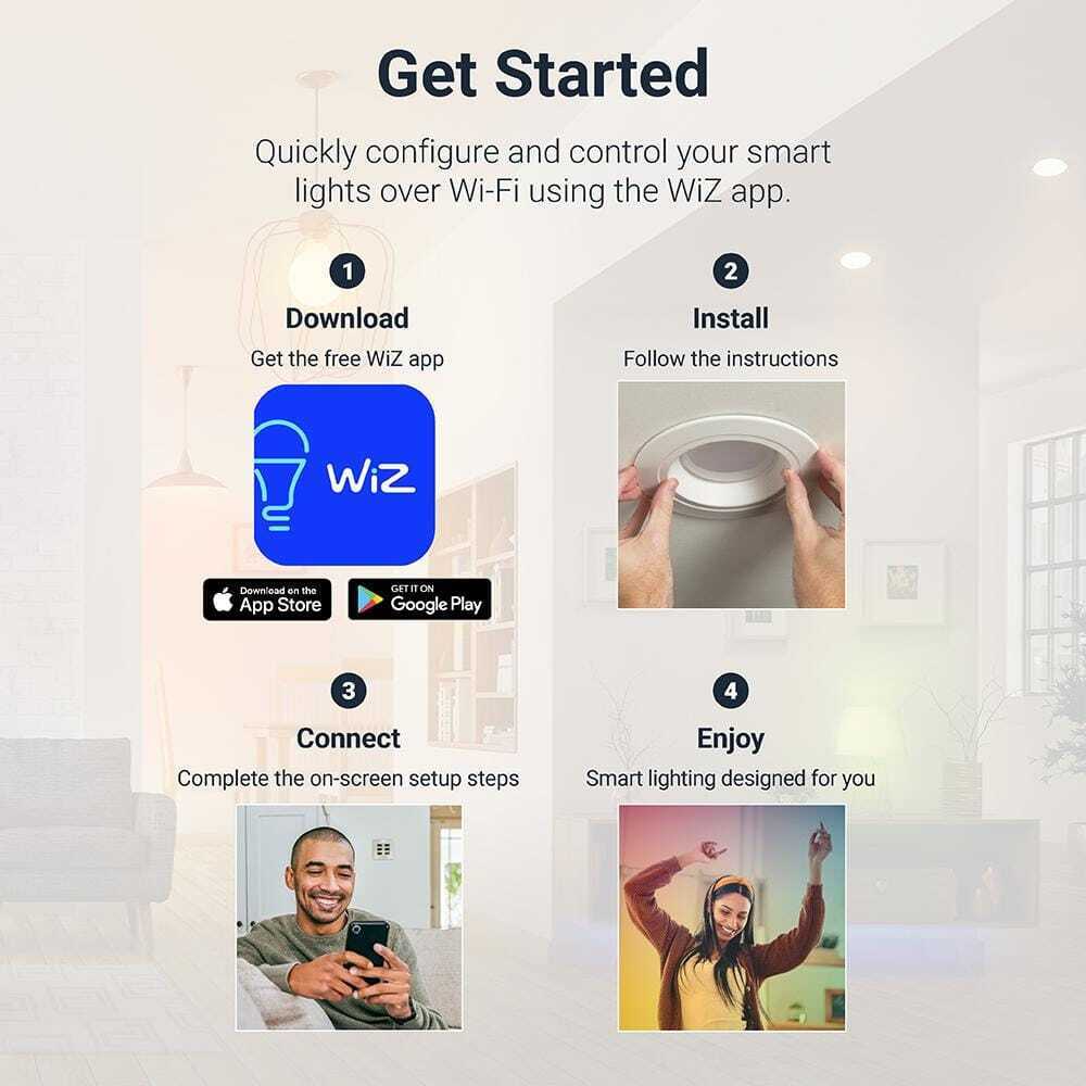HALO Smart Wi-Fi LED lighting with WiZ Pro features makes installation, management, and control of your lighting fantastically simple. With WiZ, the professional-grade lighting HALO has always delivered becomes smart. Have your rooms glow with the light you want from this full color and white tunable downlight. Dynamic rhythms can mimic natural light indoors. Use the WiZ App to control your lighting at home or from anywhere in the world, plus as a WiZ Pro device you get advanced features with the WiZ Pro Setup App and WiZ Pro Dashboard. Quickly install into housings with a standard medium socket (E26) or LED-ready orange connector and connect to your WiFi network. Compatible with WiZ Apps, WiZ Pro Dashboard, and other WiZ-enabled products along with Google Assistant, Alexa, and Siri shortcuts. Transform the way you light life with WiZ Pro-enabled products from HALO.- Smart downlight delivers warm-to-cool + full color (2200K-6500K + 16 million colors)
