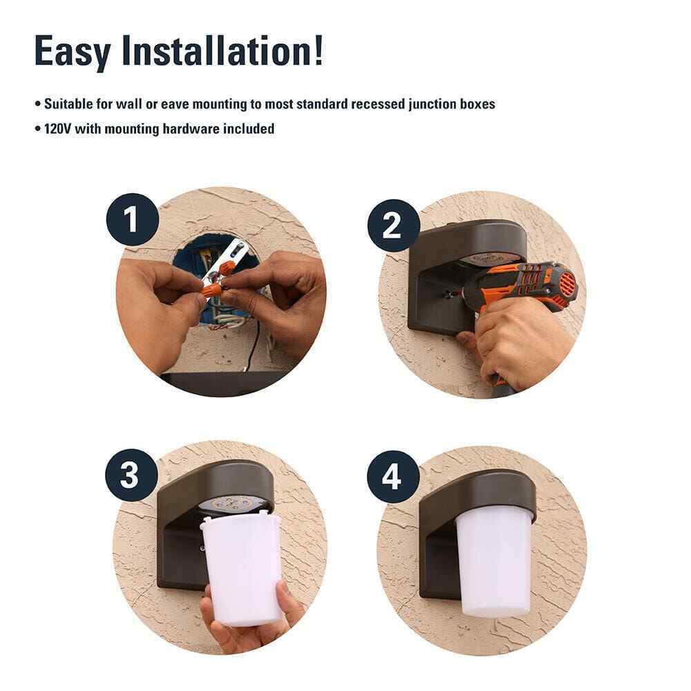 The FE series LED Entry Wall Sconces provides years of maintenance free operation by not having to replace bulbs. It comes in 3 different varieties including Standard, Lumen Selectable and a Motion Activated version with an always on Ambient Glow ring. Lumen output ranges from 800 Lumens for Basic version up to 1200 Lumens for the Lumen Select version. Highly durable and corrosion resistant polycarbonate construction in textured Bronze and White finish. This modern Wall Sconce light looks great on porches, decks, front entryways, garages and more. Great for residential or commercial applications. This fixture features a Dusk-to-Dawn photocell to help automate your outdoor lighting. It mounts easily to an existing junction box on the wall simply and easily. Designed for outdoor use and will add pleasant security light where you need it.- 3 adjustable brightness levels up to 1200 Lumens makes fixture perfect for security lighting