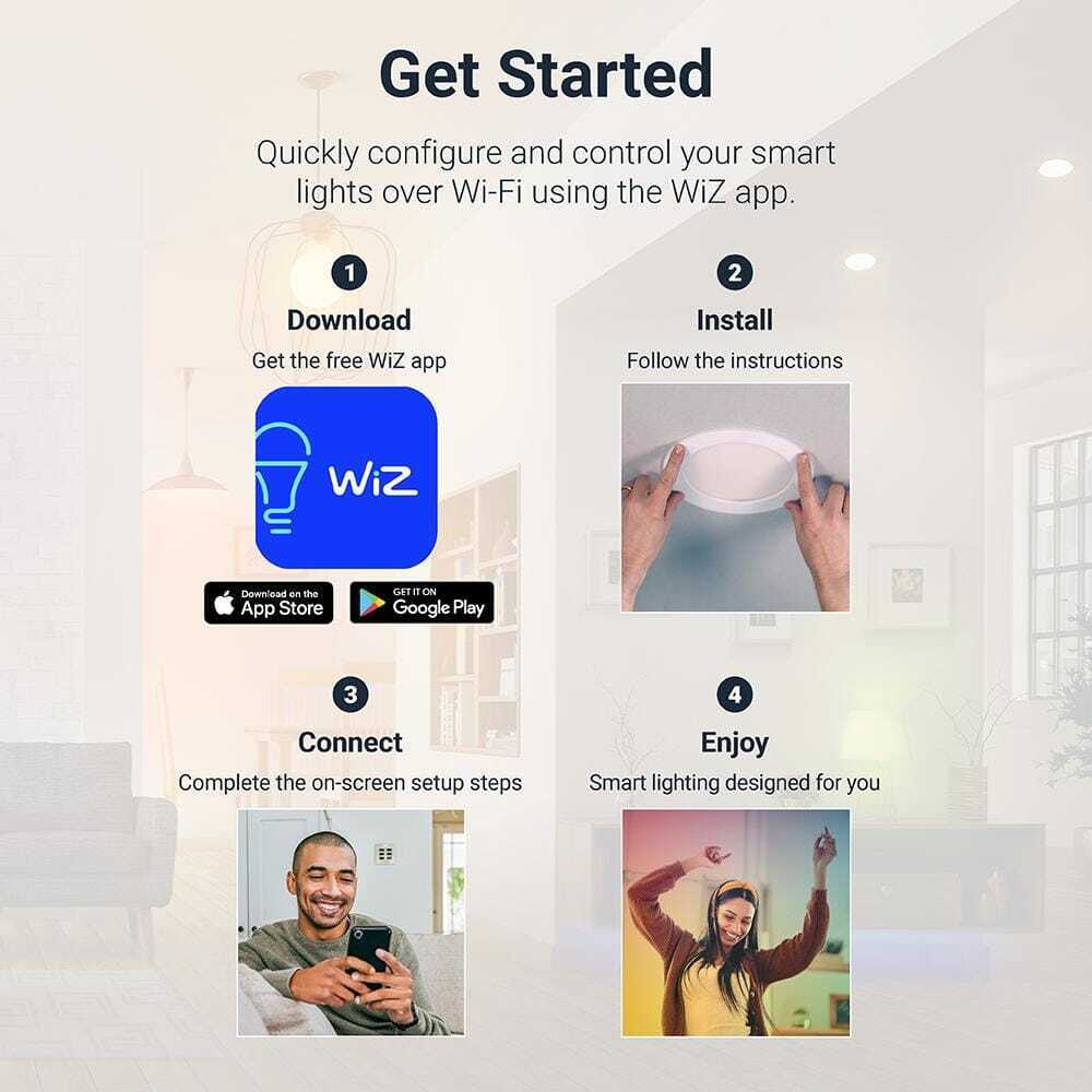 Installation, setup, and control of these HALO smart lights is surprisingly simple, thanks to WiZ Pro. Let your rooms glow with the perfect light. Use the WiZ app to set up and control lights on your local Wi-Fi. Select from warm-to-cool white or full-color lighting options, and scenes from Candlelight to Party Mode. Mimic the effects of the sun indoors with the Circadian Rhythm preset. Control smart lighting from home, from anywhere, or with your voice. Professional installers use the WiZ Pro Setup App and online WiZ Pro Dashboard to make managing multiple projects effortless. These fixtures can go where traditional downlighting can't because they're only 1/2 in. thin and mount directly to the ceiling (no housing required). Integrates with Google Assistant, Amazon Alexa, Siri shortcuts, IFTTT, and Samsung SmartThings. Compatible with all WiZ Pro and Connected by WiZ products. Transform the way you light life with WiZ Pro-enabled products from HALO.- Smart light delivers warm-to-cool plus full color (2200K-6500K plus 16 million colors)