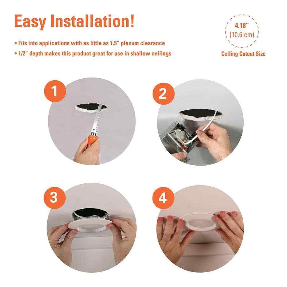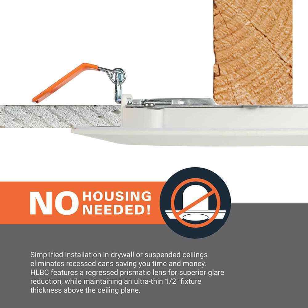 The HALO HLBC is a slim LED downlight designed with visual comfort in mind. It features a regressed prismatic lens for superior glare reduction, while maintaining an ultra-thin 1/2 in. fixture thickness above the ceiling plane. This means the HALO HLBC can be installed virtually anywhere, regardless of plenum space. The HLBC is perfect for new construction, remodel, or retrofit jobs. During installation, select the perfect color temperature for your space with 5-color temperatures between warm (2700K) to daylight (5000K) or dim-to-warm option. The dim-to-warm setting begins at 3000K and dims smoothly to 1800K, creating a rich, warm glow resembling candlelight or the sun on the horizon. The HALO HLBC is an ideal solution for residential and light commercial applications where visual comfort and installation flexibility are a priority.- 4 in. aperture