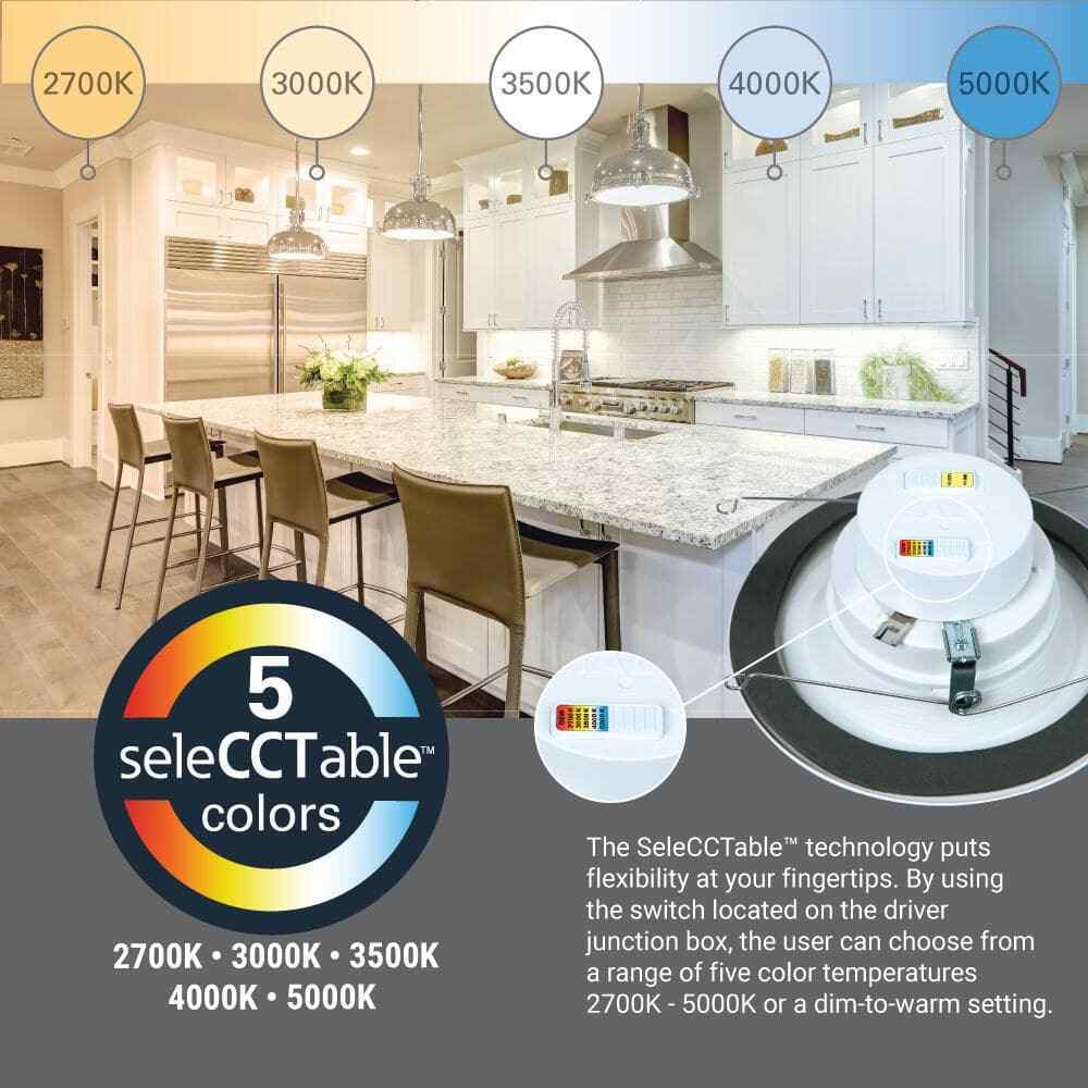 - 6-selectable color temperature options: dim-to-warm, 2700K, 3000K, 3500K, 4000K, 5000K