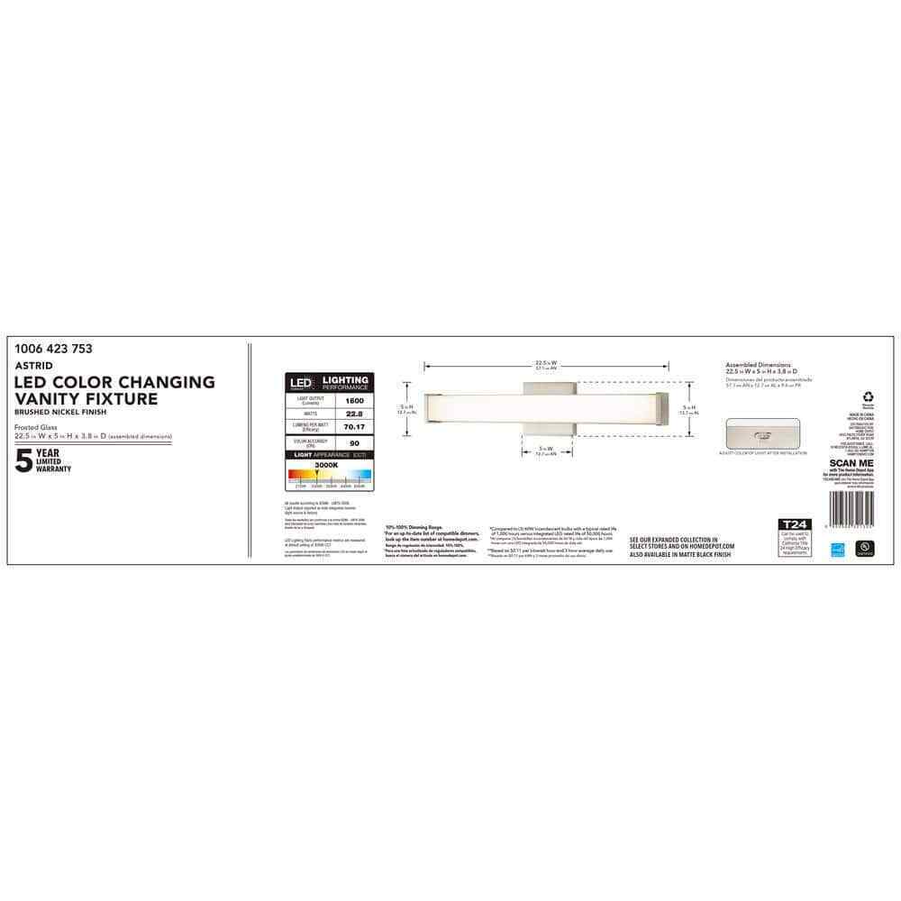 This ENERGY STAR rated 26.5 in. LED Vanity Light from Hampton Bay offers a clean transitional design to complement any decor. The Brushed Nickel finish coordinates with most bath faucets and accessories. Our LED light source and glass lens provide a warm bright light equal to three 60-Watt incandescent bulbs but using only 23-Watt of energy, a savings of over 85%. It features a selectable color temperature feature which allows you to choose your preferred white light color: warm 2700K, soft white 3000K, neutral white 3500K, bright white 4000K or daylight 5000K. Other benefits from the LED light source in the vanity fixture is that it also generates 85% less heat than a typical incandescent fixture helping to keep your bathroom or powder room cool and with the integrated LED light source there are no bulbs to change.- 2000K-3000K: gives off a soft white glow, often yellow in appearance, best for living rooms, dining rooms, bedrooms and outdoor spaces