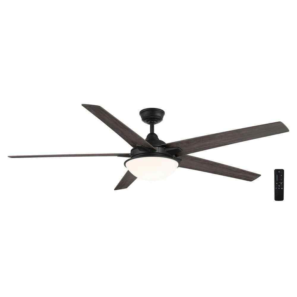 The Hampton Bay Belvoy 70 in. Matte Black Ceiling Fan presents an expansive and fashionable design. It provides the option of reversible dark gray walnut and burnished maple blade finishes. The adjustable white integrated LED light kit offers a variety of lighting options, including 3,000K, 4,000K, and 5,000K light output choices. With a DC motor offering 9 speeds, the included remote control allows for convenient adjustment of dimming, speed, and reverse functions, ensuring comfort throughout the year. DC motor fans are 70% more energy efficient than AC motor fans (when comparing efficiency (CFM/W) of DC vs AC motors in published FTC Energy Guides for ceiling fans).- 5 reversible dark gray walnut/burnished maple blades