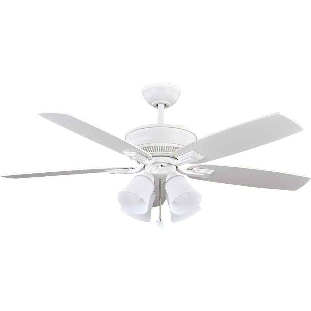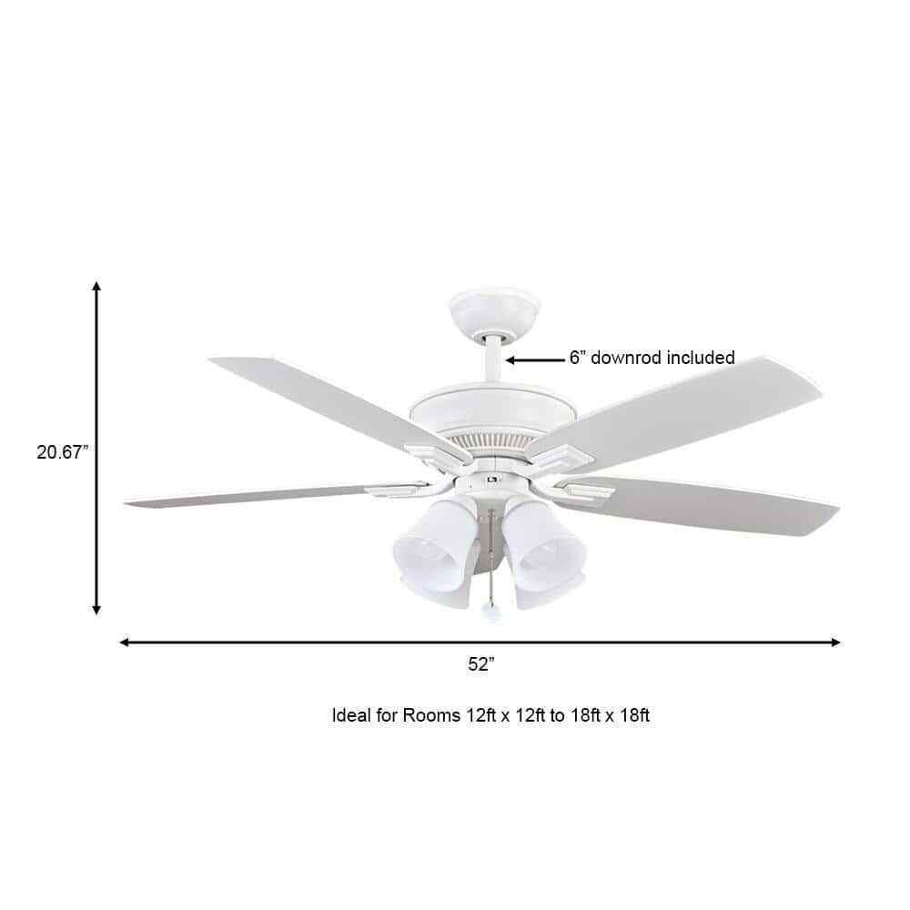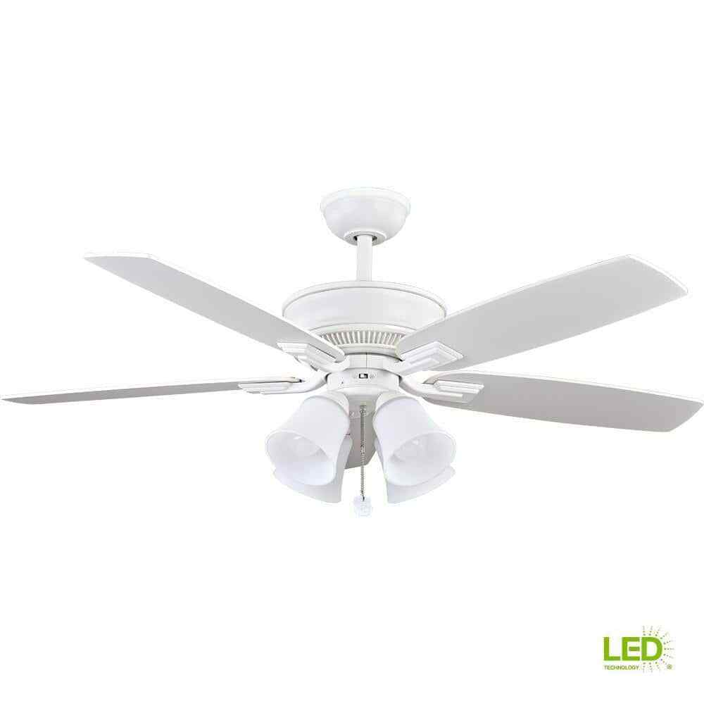 The Hampton Bay 52 in. Devron ceiling fan couples traditional elegance with design enhancements to deliver a fan that will look great for years to come. The Devron ceiling fan includes QuickFit features like a slide-on mounting bracket, QuickInstall blades, and AccuArm blade arms to make installation a breeze. The four-light light kit is designed for maximum illumination and includes four 9.5-Watt LED bulbs which last longer and use less energy than CFL or incandescent bulbs.- Matte white finish