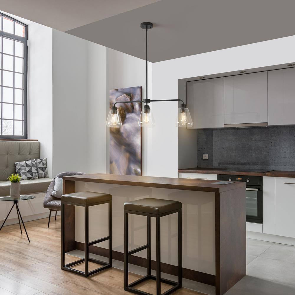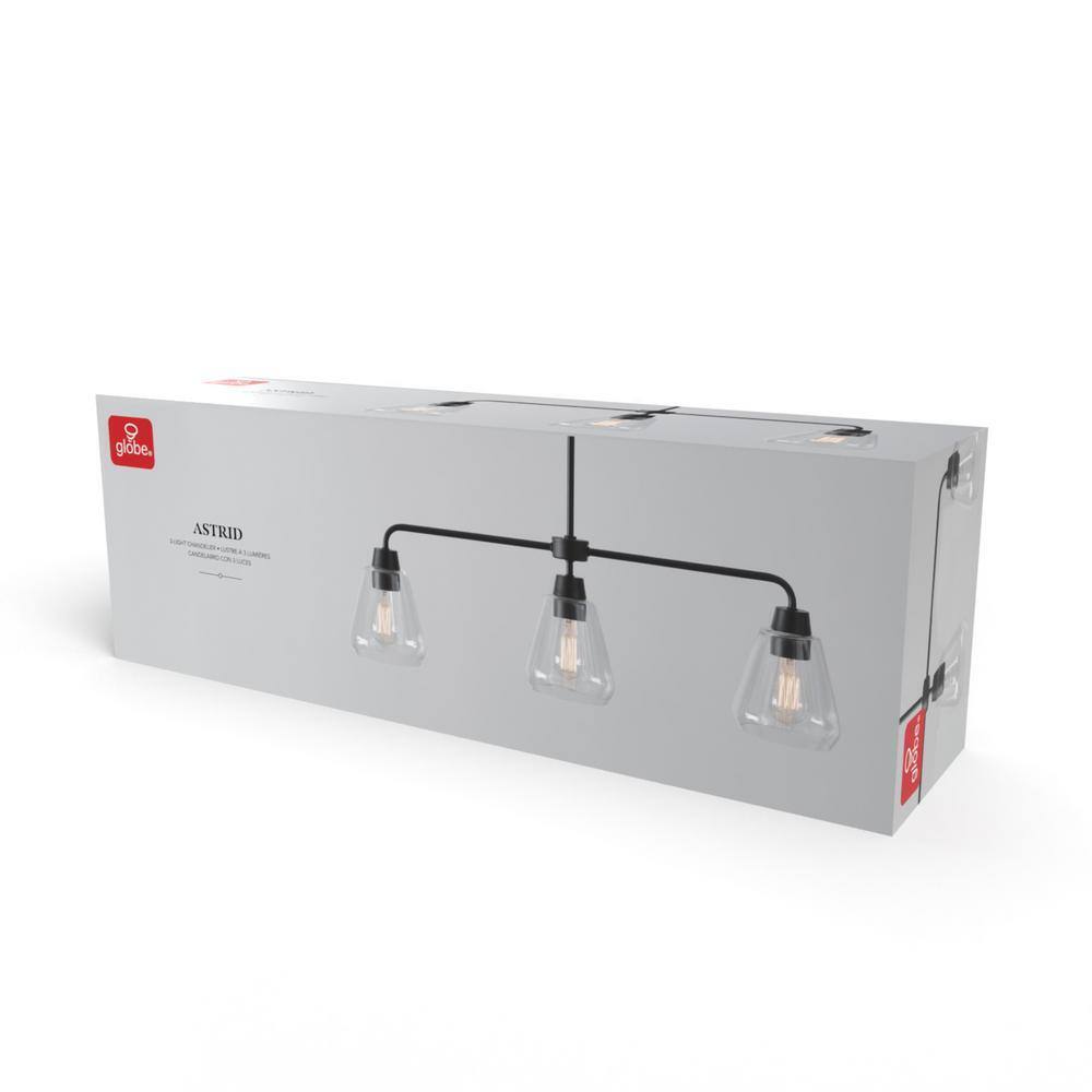 With a warm matte black finish, the Globe Electric Harvey Linear Chandelier brings refined modern farmhouse design to your well decorated home. The chic hanging bar accent contrasts the round canopy and oval sockets to create stunning visual appeal. Clear glass farmhouse style shades showcase the bulb of your choice and provide the perfect finish to a gorgeous 3-light linear chandelier.- Modern farmhouse: warm minimalism and understated geometric accents come together with the Harvey linear chandelier to epitomize the modern farmhouse design trend