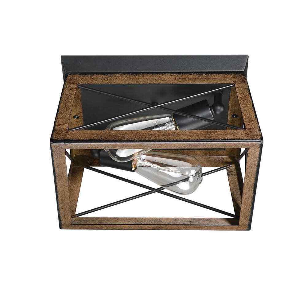 The 2-light Flush Mount with Matte black and Barnwood accents creates a sense of classic barn-like that feels relaxation and convenience at home. The open-caged light fixture features a faux-wood accents with a rich painted finish. The design of X-cage stretches across each side of the frame with farmhouse style reminds us the past of old barn doors and rustic gate in country farmhouse. The 2-light Flush Mount with Matte black and Barnwood accents ideals for any hallway, kitchen, living room, bedroom in your home. It also ideals for real farmhouse, rustic, industrial. With 2 incandescent bulbs of up to 60-Watt ceil inside the cage (Bulbs are not included). Mount this classic farmhouse ceiling light to warm up your home.- Wonderful ambient lighting: 2-light flush mount that provides a beautiful light throughout your home, farmhouse, rustic, and industrial