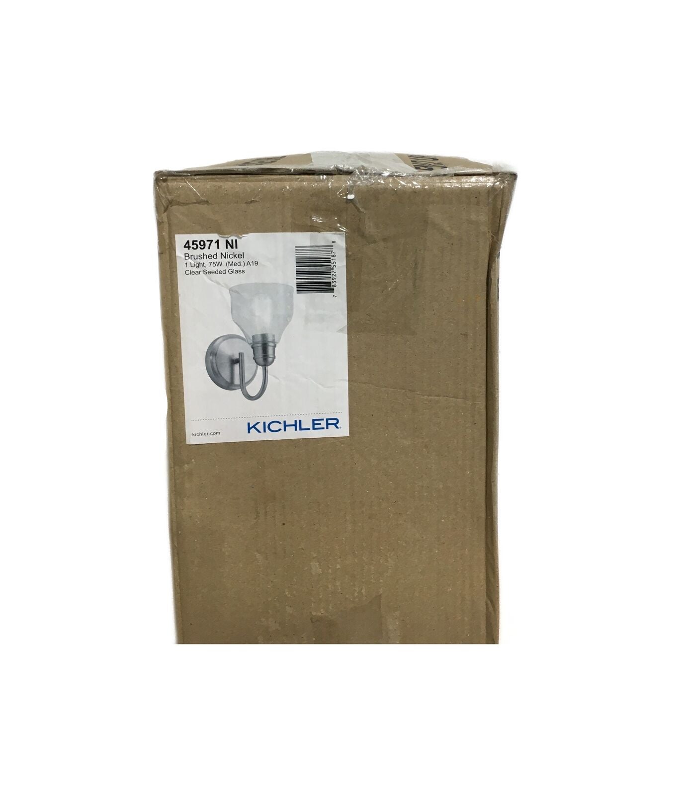 The KICHLER Avery 9.25 in. 1-Light Brushed Nickel Vanity Light with its industrial design adds a classy vibe to your transitional space. The clear seeded glass shade provides bright, even illumination. This fixture can be installed facing down or up as per your requirements: turn the shade down to highlight a mirror or an art piece or turn it up, towards the ceiling for a soft ambient light appeal. Featuring water-resistant finish, this vanity light is ideal for use in locations with humidity, such as a bathroom and sunrooms.- Steel construction ensures long-term use