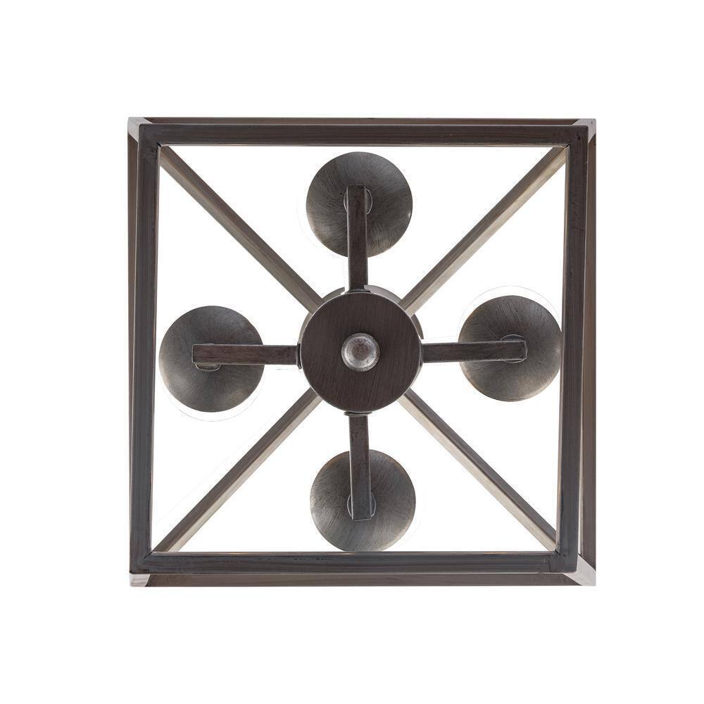 The Lacey Collection from Bel Air presents foyer, dining, and kitchen pendants designed to brighten your home's spaces and provide stylish, farmhouse appeal to your decor. Each piece in the Lacey Collection features an open caged metal shade surrounding a cluster of candlestick-style bulb sockets. The Lacey 12 inch square pendant is finished in a unique antique silver leaf, and includes a matching round ceiling canopy and chain. Four candelabra bulbs are visible inside the open frame of the pendant body, supplying ample illumination for a variety of uses.- Farmhouse pendant with custom antique silver leaf metal cage