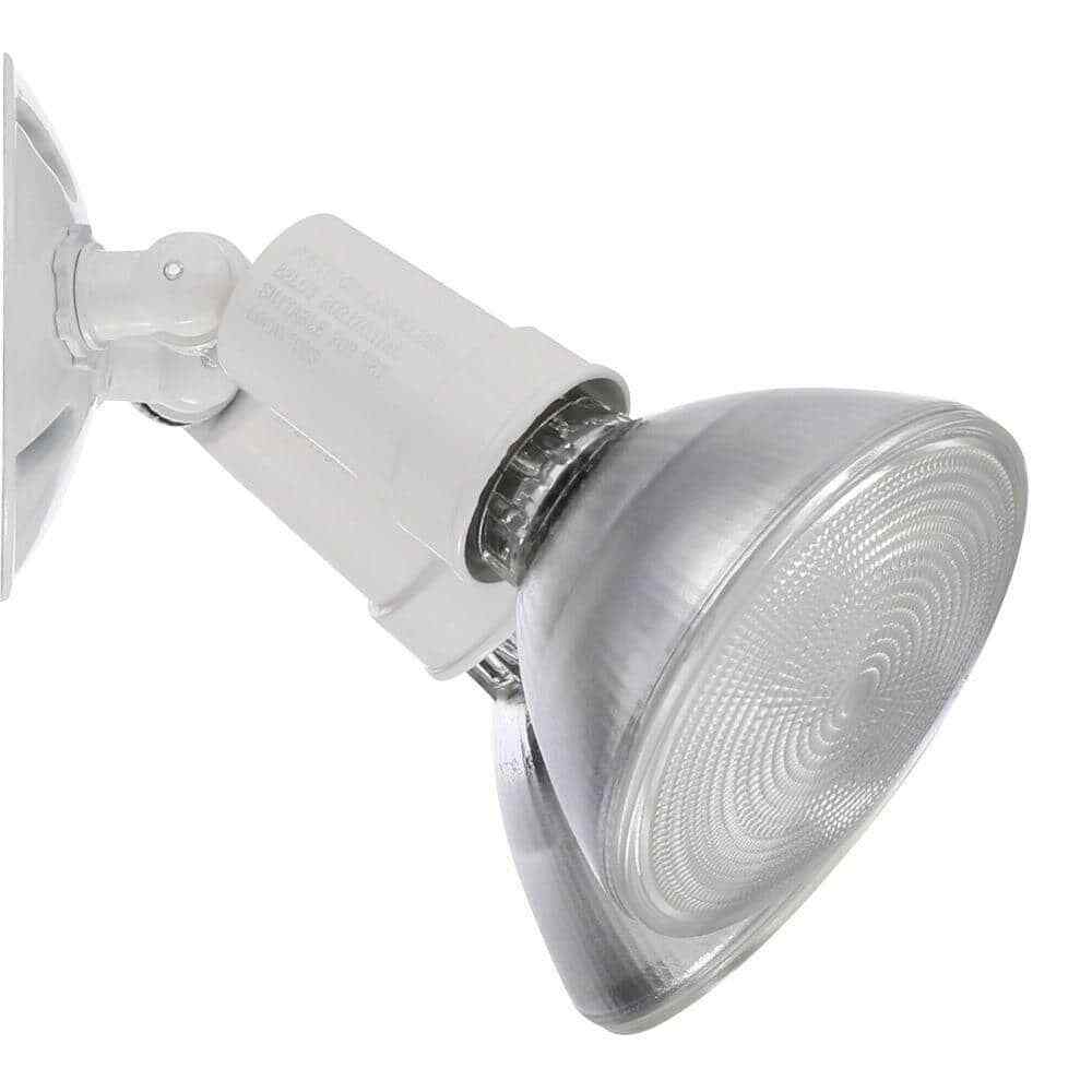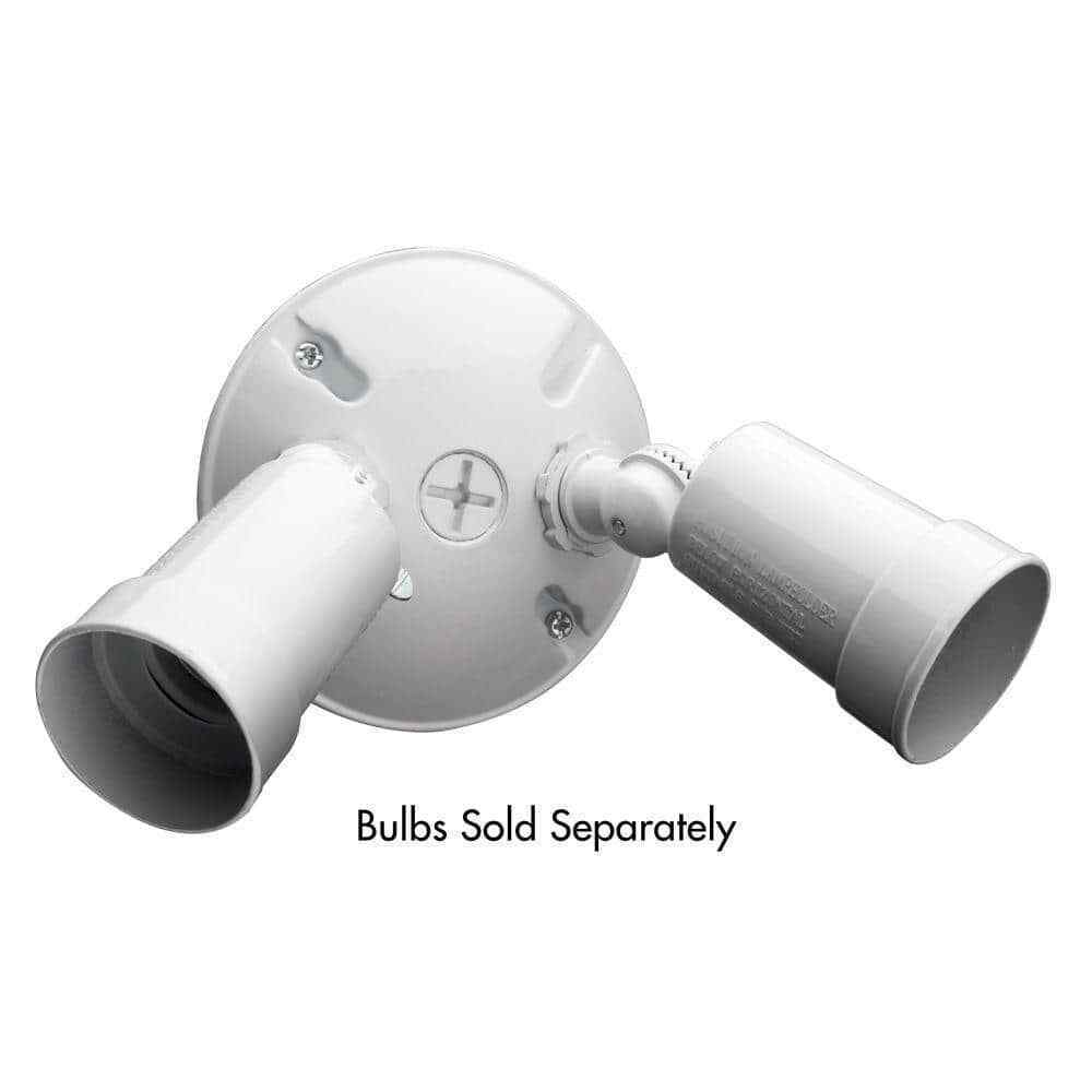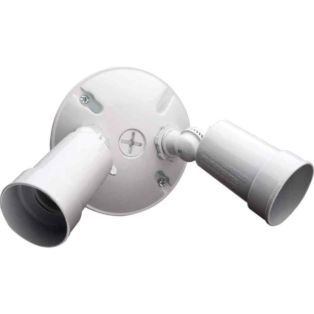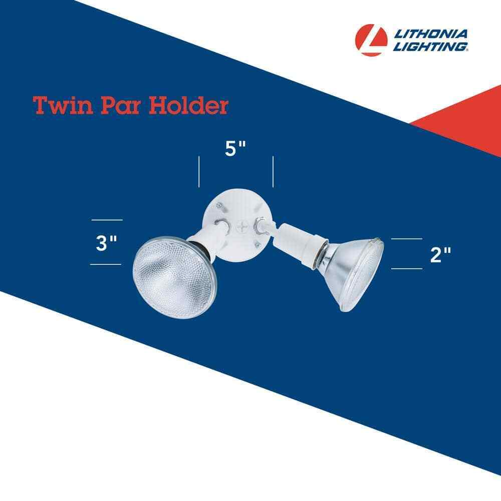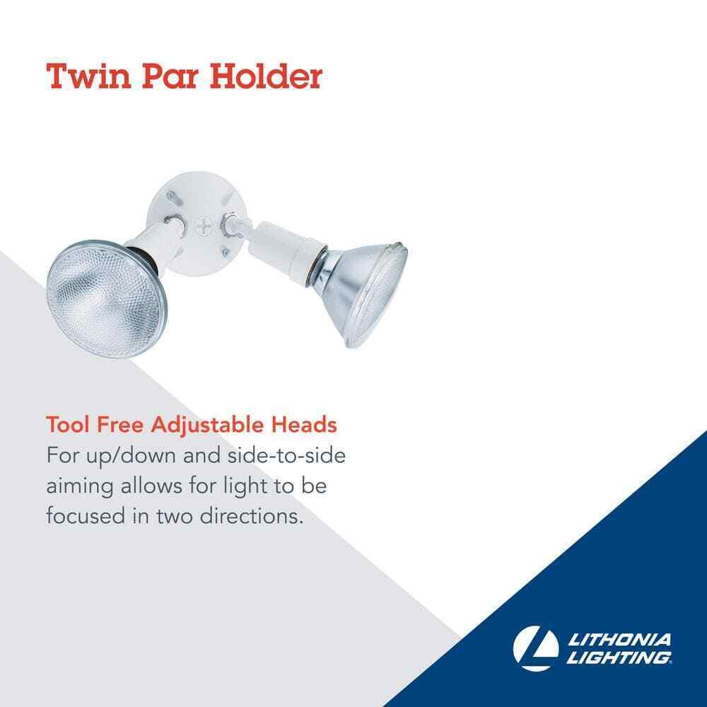 The Lithonia Lighting 2-Lamp Outdoor Floodlight has a sturdy, weather-resistant cast-aluminum housing and twin adjustable heads. Ideal for walkways, patios, and play areas creating an inviting exterior space as well as providing safety and security. It has a white finish and is designed to connect easily to the junction box. Eave or wall-mount only.- Weather-resistant aluminum housing and white finish