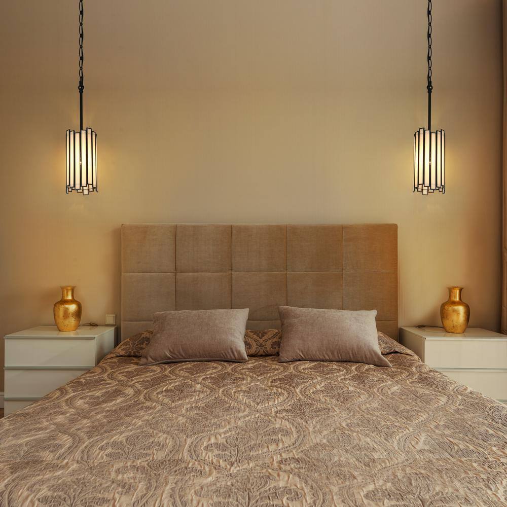 Light up your home with this 1-Light Painted Black Drum Mini Pendant Light with Modern Geometric White Stained Glass Shade! This mini pendant light has a drum-shaped frame with a combination of rectangular geometric shapes and a petite body. Painted black lines seal each rectangular piece of white stained glass giving this geometric drum fixture a modern twist. You can place it in various spaces such as the living room, bedroom, foyer, dining room, etc.- Modern mini pendant light: the geometric cylinder outlook and white stained glass shade enhance the contemporary style of this pendant light fixture