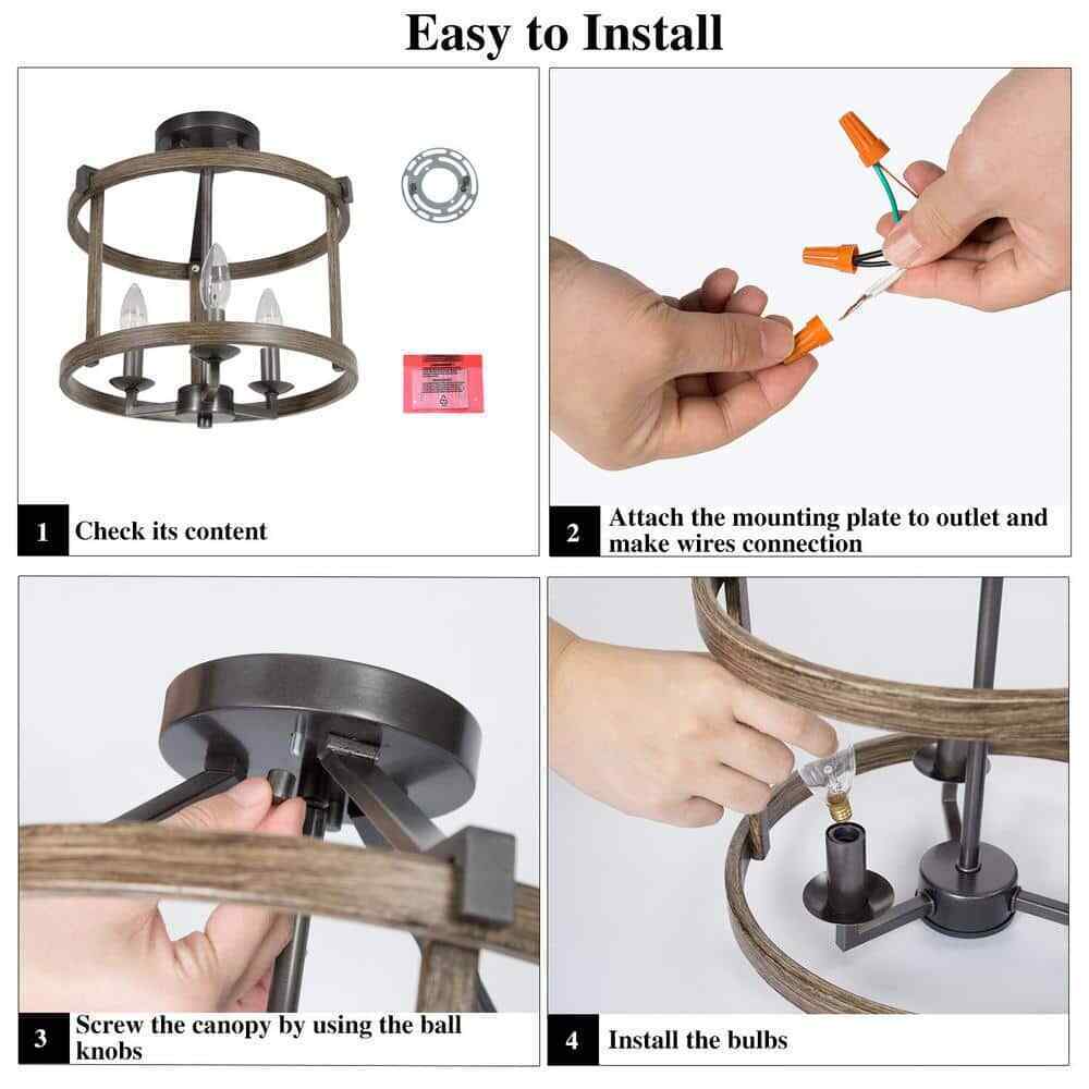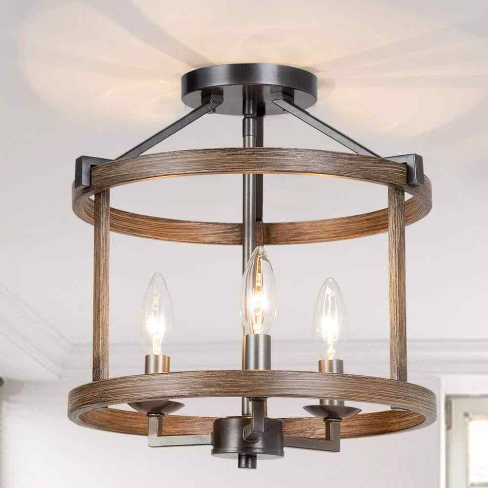 Gives your space a cozy and comfortable atmosphere with this classic barn-like touch of 3-Light Modern Farmhouse Bronze Semi-Flush Mount Rustic Drum Cage Lantern Semi-Flush Mount Ceiling Light with Faux Wood Accents by LNC. The open-caged light fixture features in bronze finish metal frame with aged oak accents. The simple lines formed a lantern shape with an open design that allows for enough illumination and unleashes space vitality. In the meanwhile, the inner candlestick base and light bulbs lighted (not included) are exposed in people's eyes and bring people a visual treat. The unique design blends farmhouse, rustic, classic, and transitional elements together and fits most interior decors. It does not require a certain ceiling height, also workable in the lower ceilings. This small semi-flush mount is perfect for the foyer, hallway, or bedroom.- Multi-Style: This farmhouse drum semi-flush mount features metal wood accents bands that create an open-cage drum shape design. The aged oak wood and bronze finish adds a taste of rustic farmhouse, modern industrial, vintage charm