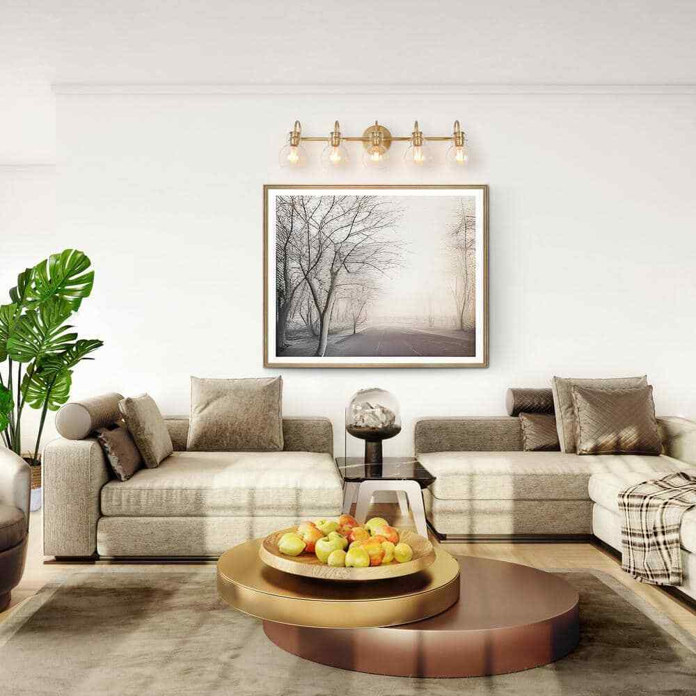 The light gold finish paired with globe clear glass shades is always a classic modern outlook. This LNC Light Gold Vanity Modern Linear 35.5 in. 5-Light Contemporary Bathroom Powder Room Light with Round Clear Glass Shades is totally perfect for your modern house. The liner bar and curve bar are made up together to hold 5 lights. Globe shape clear glass shades decorate light fixtures well with a light gold finish metal body. Install it in your bathroom, powder room, living room, bedroom, and any nooks you need is a great idea.- Modern vanity light: light gold finish and clear glass shades combination match modern style house very well