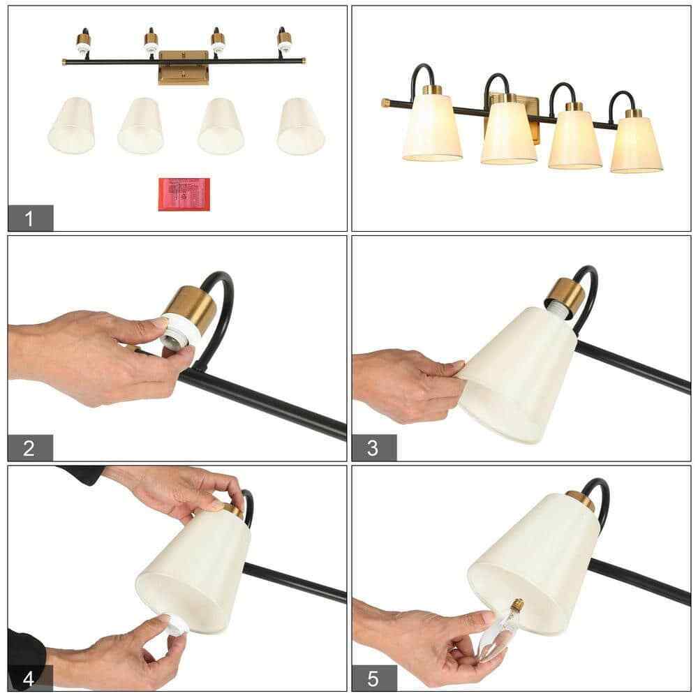 Bring this LNC Jacarmellia Modern Classic 28 in. W 4-Light Plated Brass and Black Linear Vanity Light with White Cone Fabric Shades light fixture to your elegant home is a great idea. Fabric shades with cone shapes and white colors decorate your modern classic house. Plated brass and black finish metal design with linear and curve combination provide a modern contemporary outlook. 4-light modern vanity light with 28 in. W is suitable for the larger vanity and mirror. Placing this classic vanity light in your bathroom, powder room, living room, hallway and more is wonderful.- Classic simple vanity light: linear and curve design metal frame with plated brass and black finish complements cone shape white fabric shades