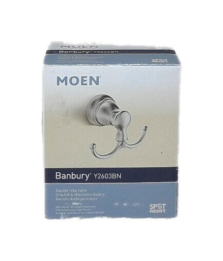 The Moen Banbury Double Robe Hook in Brushed Nickel has a traditional design and an appealing, lightly brushed gray metallic finish. This innovative Spot Resist finish resists fingerprints and water spots to maintain the brilliance of the original finish and easily wipes cleans. It complements other Banbury bath accessories and comes with installation hardware included.- Spot Resist Brushed Nickel resists fingerprints and water spots