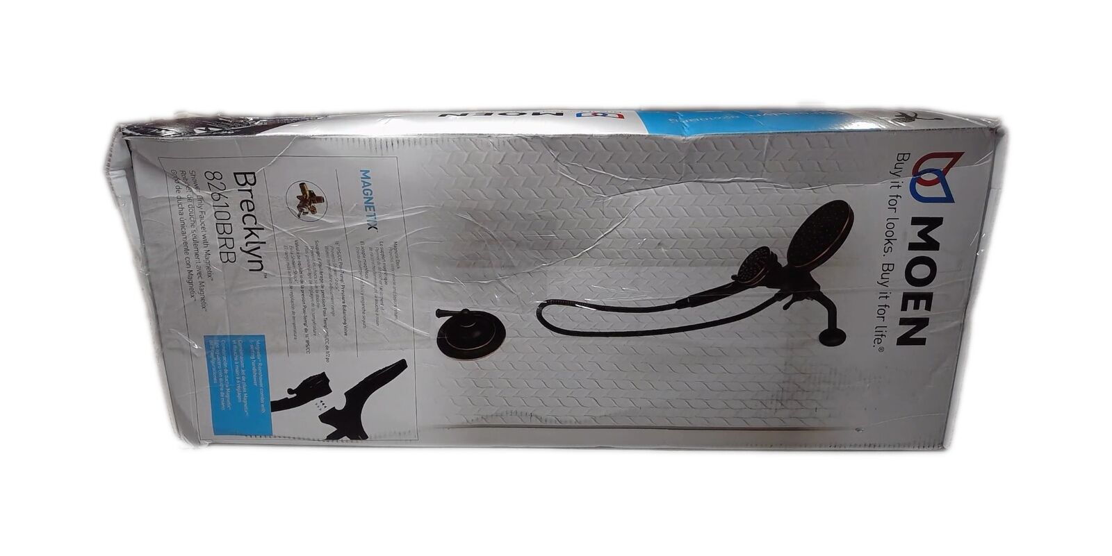 The Brecklyn shower only faucet provides a traditional look that appeals to those with classic style preferences. The showerhead is a combination rainshower and handshower featuring Moenâ¬"s innovative Magnetix technology on the handshower. Handshowers with Magnetix offer a powerful magnetic dock that allows for easy release and secure return of the handshower, even with your eyes closed. Brecklyn includes a 6.75-inch spray face on the rainshower and a 3.75-inch spray face on the handheld, as well as six high-performance spray functions, for the ultimate spa-like experience. Moenâ¬"s unique Posi-Temp pressure-balancing valve adjusts automatically to changes in water line pressure ⬠ensuring constant and comfortable water temperatures. The fixture is available in Mediterranean Bronze Finish.- Snap to use; easy release and return with magnetic docking system, even with your eyes closed
