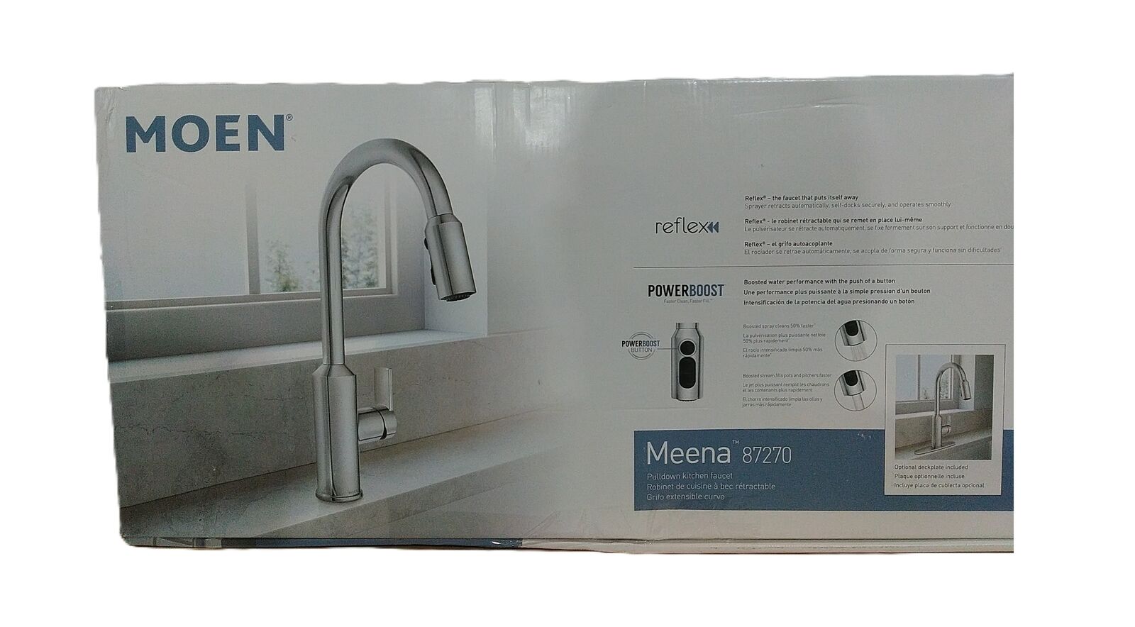 From intimate galley kitchens to large gourmet workstations, Meena faucets bring a refreshed look to your home. Simple lines create the contemporary style, while a pulldown wand delivers in-demand functionality. Featuring MOEN exclusive Power Boost technology, Meena has a 4-function pulldown spray wand with standard stream and spray, as well as boosted stream and spray modes.