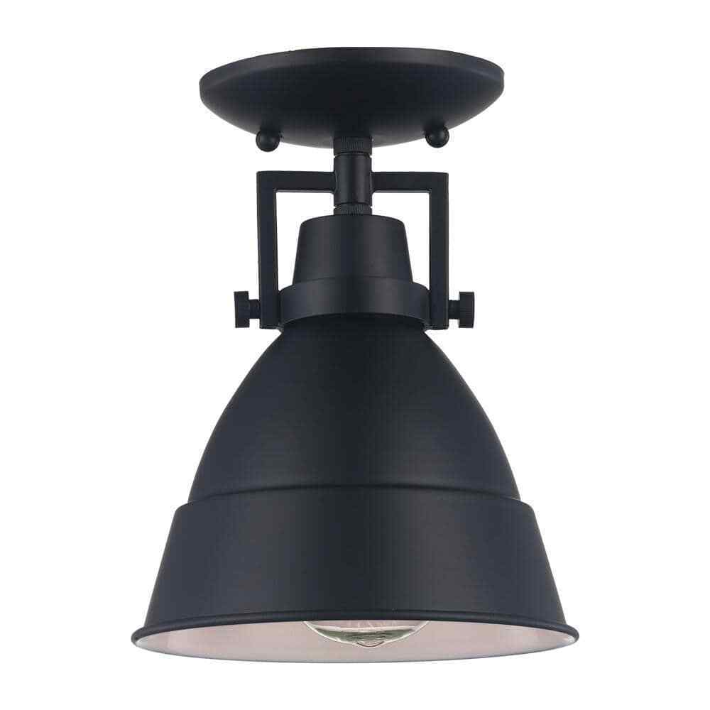 This Monteaux semi flush mounted ceiling light comes in a classic black finish, ideal for coordinating with existing decor styles. Rustic details are present throughout the piece, and the all-metal shade is reminiscent of industrial style lighting. The 7 inch shade is open at the bottom, providing directional illumination from the single down-light bulb. A vintage Edison style light bulb is recommended to capitalize on the industrial styling. This piece finds itself at home in a variety of indoor home styles, from modern to farmhouse. This semi flush light is dry rated and suitable for use in living rooms, kitchens, bedrooms, and more.- Fixture comes in classic black finish