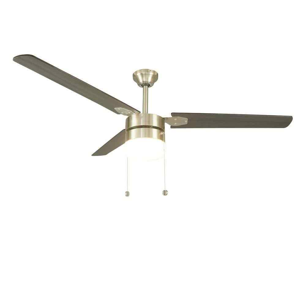 The Montgomery 56 in. indoor ceiling fan comes in a distinctive Brushed Nickel finish, suitable to match the decor and style of your room with reversible blades included for further customization. A 9-Watt LED bulb is included with purchase and provides lighting beneath a brilliant opal white glass shade. The light and 3 speed settings are pull-chain controlled for your convenience, while the motor can be reversed depending on season.- 56 in. indoor fan in a distinctive brushed nickel finish