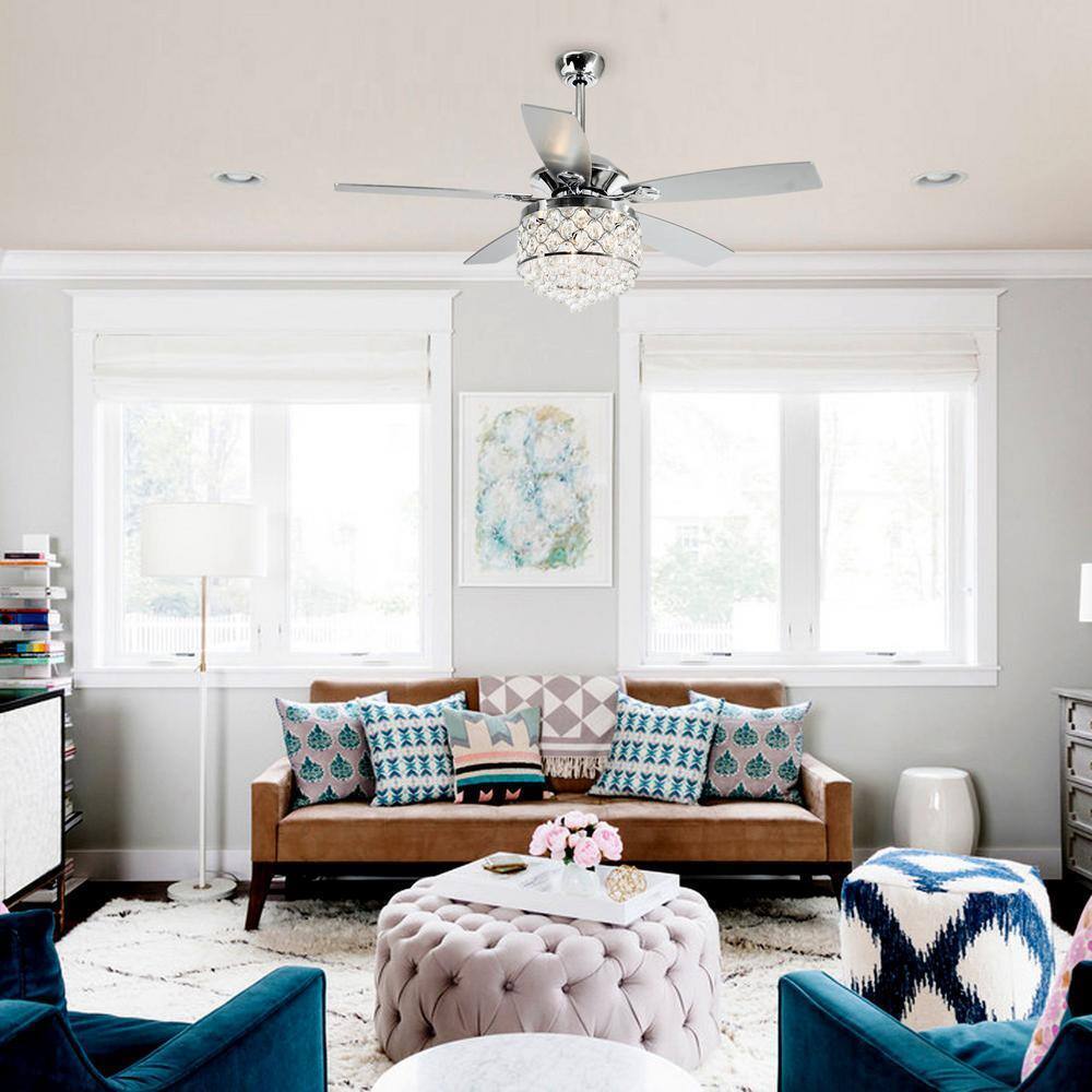 This 52 in. crystal ceiling fan keeps your space cool and bright, which brings design and function together in this beautifully designed lighted ceiling fan. Featuring a chrome finish chandelier ceiling fan adorned with glass crystals. 3 fan speeds and reversible motor help keep you comfortable year-round. It can bring cool wind in summer and keep air fresh in winter.- Ceiling fans with lights: it takes four 25-Watt candelabra base (E-12) incandescent bulbs (not included) which provide ample illumination